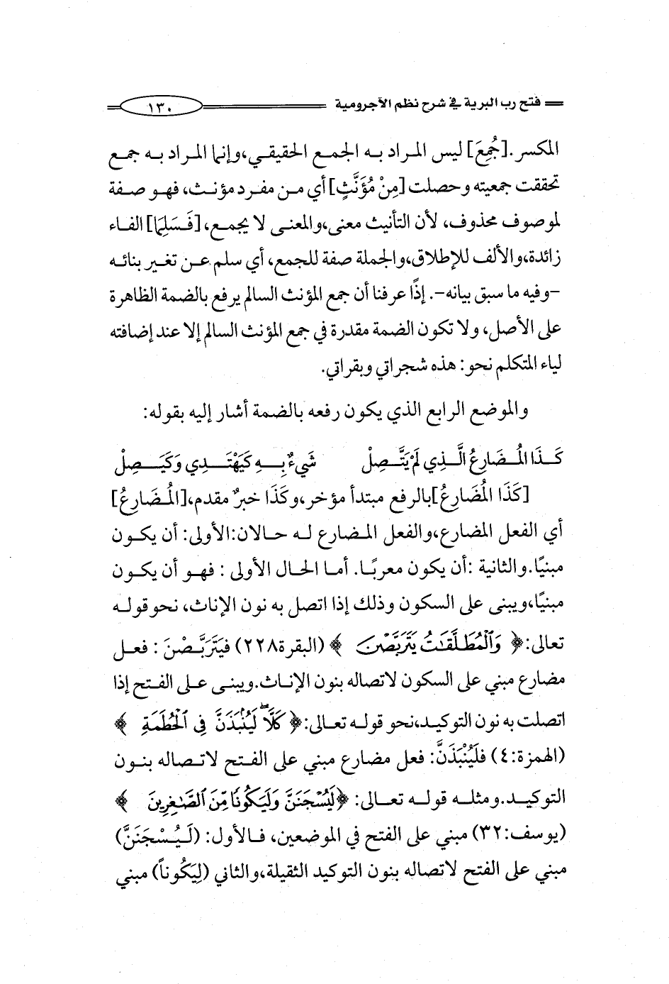 المكسر. [جُمِعَ] ليس المراد به الجمع الحقيقي، وإنما المراد به جمع تحققت جمعيتة وحصلت [مِنْ مُؤَنَّثٍ] أي من مفرد مؤنث، فهو صفة لموصوف محذوف، لأن التأنيث معنى، والمعنى لا يجمع، [فَسَلِمَا] الفاء زائدة، والألف للإطلاق، والجملة صفة للجمع، أي سلم عن تغير بنائه-وفيه ما سبق بيانه-.إذًا عرفنا أن جمع المؤنث السالم يرفع بالضمة الظاهرة على الأصل، ولا تكون الضمة مقدرة في جمع المؤنث السالم إلا عند إضافته لياء المتكلم نحو: هذه شجراتي وبقراتي.