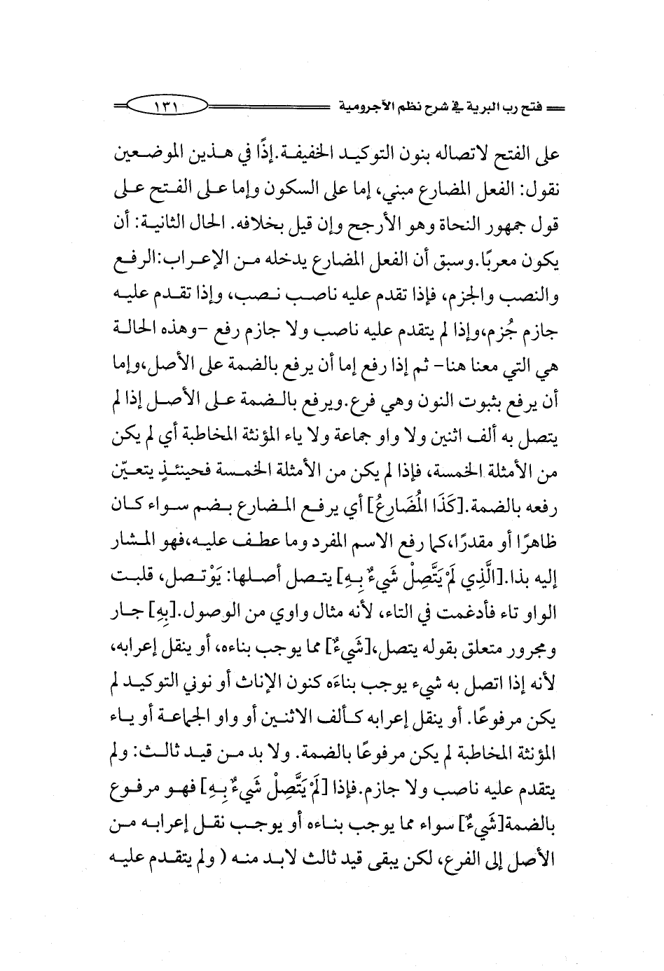 على الفتح لاتصاله بنون التوكيد الخفيفة. إذًا في هذين الموضعين نقول: الفعل المضارع مبني، إما على السكون وإما على الفتح على قول جمهور النحاة وهو الأرجح وإن قيل بخلافه. الحال الثانية: أن يكون معربًا. وسبق أن الفعل المضارع يدخله من الإعراب: الرفع والنصب والجزم، فإذا تقدم عليه ناصب نصب، وإذا تقدم عليه جازم جُزم، وإذا لم يتقدم عليه ناصب ولا جازم رفع -وهذه الحالة هي التي معنا هنا- ثم إذا رفع إما أن يرفع بالضمة على الأصل، وإما أن يرفع بثبوت النون وهي فرع. ويرفع بالضمة على الأصل إذا لم يتصل به ألف اثنين ولا واو جماعة ولا ياء المؤنثة المخاطبة أي لم يكن من الأمثلة الخمسة، فإذا لم يكن من الأمثلة الخمسة فحينئذٍ يتعيّن رفعه بالضمة. [كَذَا المُضَارِعُ] أي يرفع المضارع بضم سواء كان ظاهرًا أو مقدرًا، كما رفع الاسم المفرد وما عطف عليه، فهو المشار إليه بذا. [الَّذِي لَمْ يَتَّصِلْ شَيءٌ بِهِ] يتصل أصلها: يَوْتصل، قلبت الواو تاء فأدغمت في التاء، لأنه مثال واوي من الوصول. [بِهِ] جار ومجرور متعلق بقوله يتصل، [شَيءٌ] مما يوجب بناءه، أو ينقل إعرابه، لأنه إذا اتصل به شيء يوجب بناءَه كنون الإناث أو نوني التوكيد لم يكن مرفوعًا، أو ينقل إعرابه كألف الاثنين أو واو الجماعة أو ياء المؤنثة المخاطبة. فإذا اتصل به شيء ينقل إعرابه لم يكن مرفوعًا بالضمة. ولا بد من قيد ثالث: ولم يتقدم عليه ناصب ولا جازم. فإذا [لَمْ يَتَّصِلْ شَيءٌ بِهِ] فهو مرفوع بالضمة [شَيءٌ] سواء مما يوجب بناءه أو يوجب نقل إعرابه من الأصل إلى الفرع، لكن يبقى قيد ثالث لابد منه (ولم يتقدم عليه