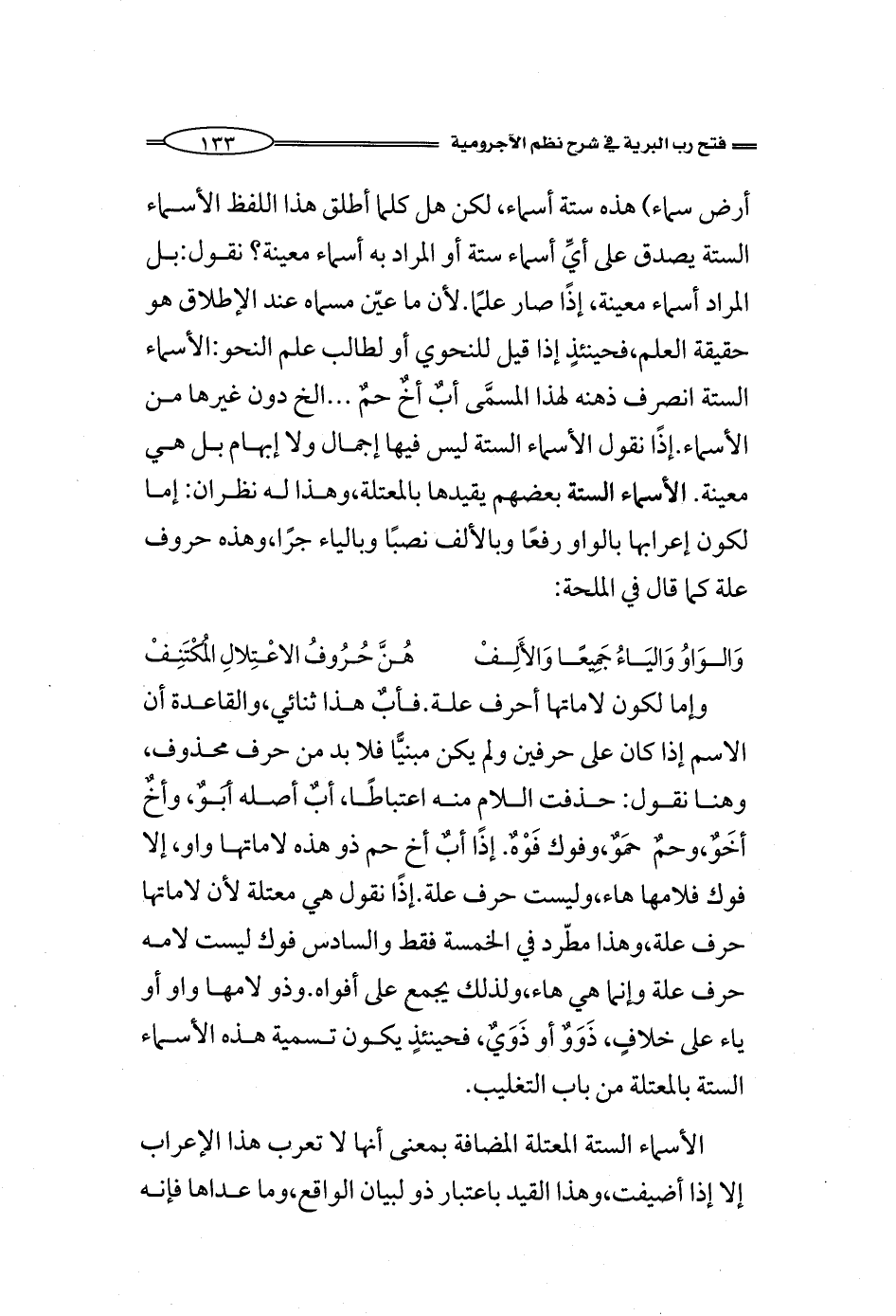 أرض سماء) هذه ستة أسماء، لكن هل كلما أطلق هذا اللفظ الأسماء الستة يصدق على أيِّ أسماء ستة أو المراد به أسماء معينة؟ نقول: بل المراد أسماء معينة، إذًا صار علمًا. لأن ما عيّن مسماه عند الإطلاق هو حقيقة العلم، فحينئذٍ إذا قيل للنحوي أو لطالب علم النحو: الأسماء الستة انصرف ذهنه لهذا المسمَّى أبٌ أخٌ حمٌ ... الخ دون غيرها من الأسماء. إذًا نقول الأسماء الستة ليس فيها إجمال ولا إبهام بل هي معينة. الأسماء الستة بعضهم يقيدها بالمعتلة، وهذا له نظران: إما لكون إعرابها بالواو رفعًا وبالألف نصبًا وبالياء جرًا، وهذه حروف علة كما قال في الملحة: