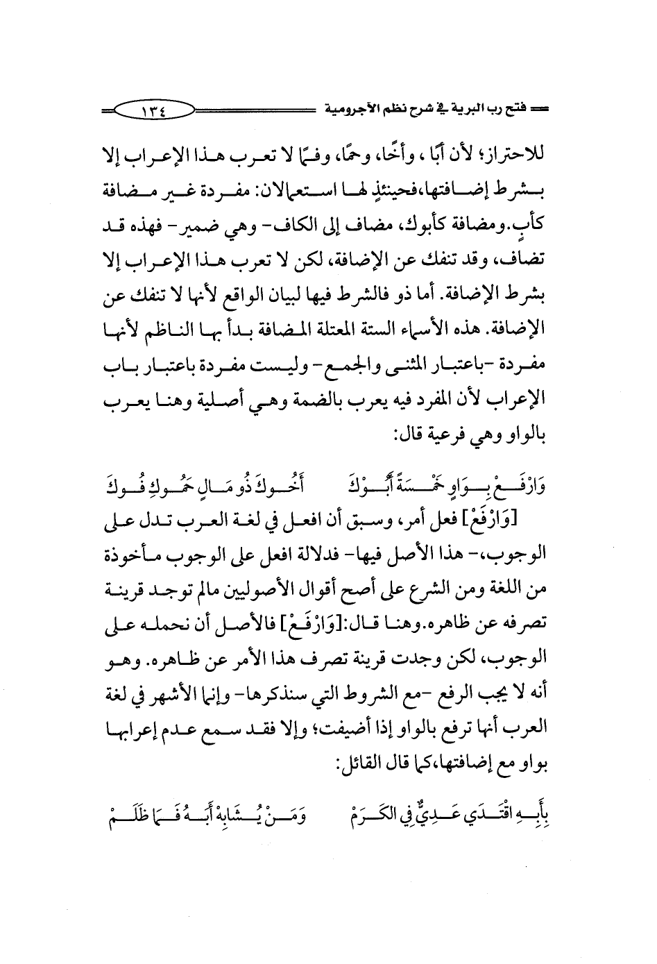 [وَارْفَعْ] فعل أمر، وسبق أن افعل في لغة العرب تدل على الوجوب،- هذا الأصل فيها- فدلالة افعل على الوجوب مأخوذة من اللغة ومن الشرع على أصح أقوال الأصوليين مالم توجد قرينة تصرفه عن ظاهره. وهنا قال: [وَارْفَعْ] فالأصل أن نحمله على الوجوب، لكن وجدت قرينة تصرف هذا الأمر عن ظاهره. وهو أنه لا يجب الرفع -مع الشروط التي سنذكرها- وإنما الأشهر في لغة العرب أنها ترفع بالواو إذا أضيفت؛ وإلا فقد سمع عدم إعرابها بواو مع إضافتها، كما قال القائل: