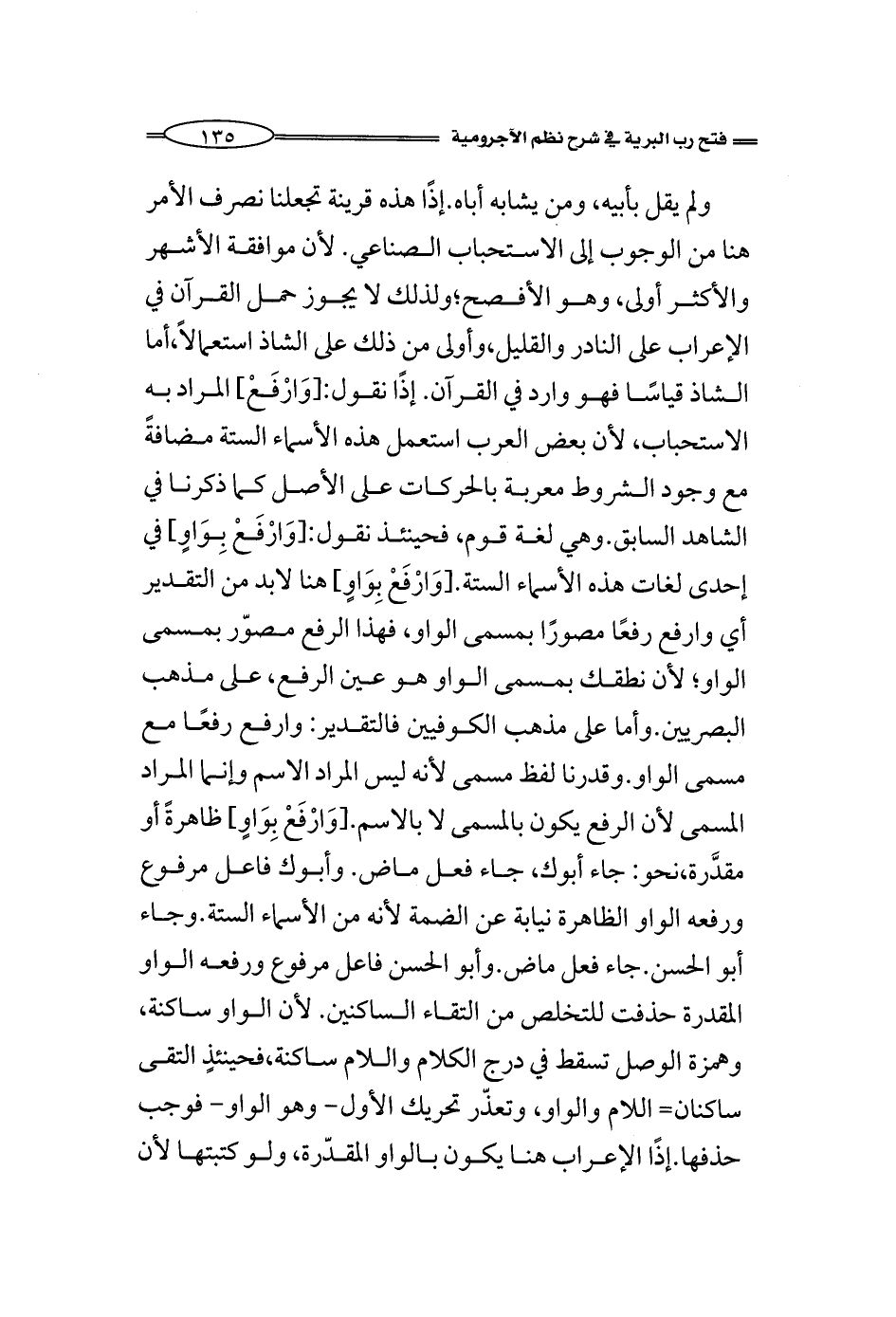 ولم يقل بأبيه، ومن يشابه أباه. إذًا هذه قرينة تجعلنا نصرف الأمر هنا من الوجوب إلى الاستحباب الصناعي. لأن موافقة الأشهر والأكثر أولى، وهو الأفصح؛ ولذلك لا يجوز حمل القرآن في الإعراب على النادر والقليل، وأولى من ذلك على الشاذ استعمالاً، أما الشاذ قياسًا فهو وارد في القرآن. إذًا نقول: [وَارْفَعْ] المراد به الاستحباب، لأن بعض العرب استعمل هذه الأسماء الستة مضافةً مع وجود الشروط معربة بالحركات على الأصل كما ذكرنا في الشاهد السابق. وهي لغة قوم، فحينئذ نقول: [وَارْفَعْ بِوَاوٍ] في إحدى لغات هذه الأسماء الستة. [وَارْفَعْ بِوَاوٍ] هنا لابد من التقدير أي وارفع رفعًا مصورًا بمسمى الواو، فهذا الرفع مصوّر بمسمى الواو؛ لأن نطقك بمسمى الواو هو عين الرفع، على مذهب البصريين. وأما على مذهب الكوفيين فالتقدير: وارفع رفعًا مع مسمى الواو. وقدرنا لفظ مسمى لأنه ليس المراد الاسم وإنما المراد المسمى لأن الرفع يكون بالمسمى لا بالاسم. [وَارْفَعْ بِوَاوٍ] ظاهرةً أو مقدَّرة، نحو: جاء أبوك، جاء فعل ماض. وأبوك فاعل مرفوع ورفعه الواو الظاهرة نيابة عن الضمة لأنه من الأسماء الستة. وجاء أبو الحسن. جاء فعل ماض. وأبو الحسن فاعل مرفوع ورفعه الواو المقدرة حذفت للتخلص من التقاء الساكنين. لأن الواو ساكنة، وهمزة الوصل تسقط في درج الكلام واللام ساكنة، فحينئذٍ التقى ساكنان= اللام والواو، وتعذّر تحريك الأول- وهو الواو- فوجب حذفها. إذًا الإعراب هنا يكون بالواو المقدّرة، ولو كتبتها لأن