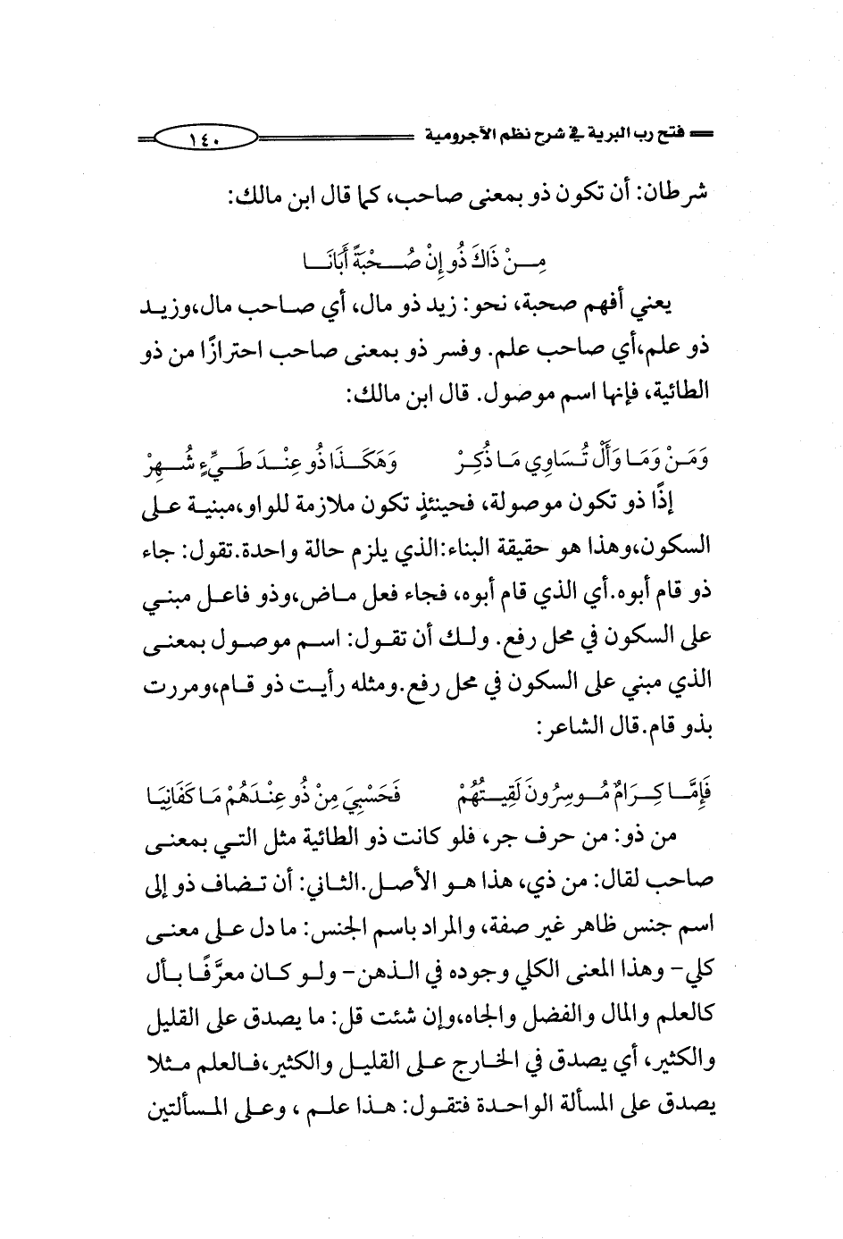 يعني أفهم صحبة، نحو: زيد ذو مال، أي صاحب مال، وزيد ذو علم، أي صاحب علم. وفسر ذو بمعنى صاحب احترازًا من ذو الطائية، فإنها اسم موصول. قال ابن مالك: