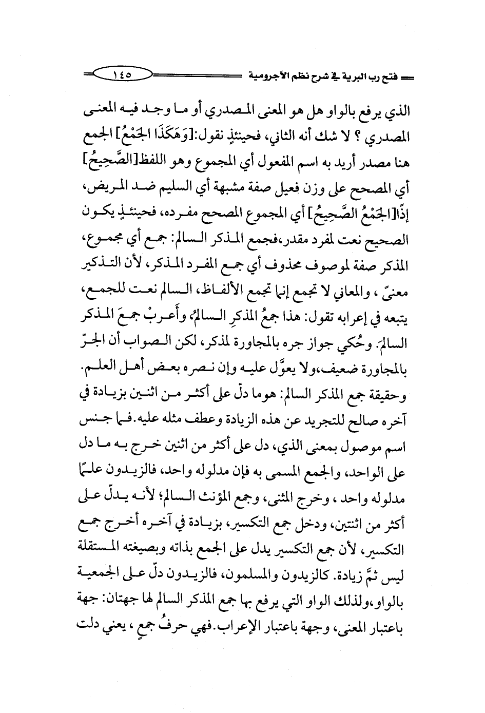 الذي يرفع بالواو هل هو المعنى المصدري أو ما وجد فيه المعنى المصدري؟ لا شك الثاني، فحينئذٍ نقول: [وَهَكَذَا الجَمْعُ] الجمع هنا مصدر أريد به اسم المفعول أي المجموع وهو اللفظ [الصَّحِيحُ] أي المصحح على وزن فعيل صفة مشبهة أي السليم ضد المريض، إذًا [الجَمْعُ الصَّحِيحُ] أي المجموع المصحح مفرده، فحينئذٍ يكون الصحيح نعت لمفرد مقدر، فجمع المذكر السالم: جمع أي مجموع، المذكر صفة لموصوف محذوف أي جمع المفرد المذكر، لأن التذكير معنىً، والمعاني لا تجمع إنما تجمع الألفاظ، السالم نعت للجمع، يتبعه في إعرابه تقول: هذا جمعُ المذكرِ السالمُ، وأَعربْ جمعَ المذكر السالمَ. وحُكي جواز جره بالمجاورة لمذكر، لكن الصواب أن الجرّ بالمجاورة ضعيف، ولا يعوَّل عليه وإن نصره بعض أهل العلم. وحقيقة جمع المذكر السالم: هوما دلّ على أكثر من اثنين بزيادة في آخره صالح للتجريد عن هذه الزيادة وعطف مثله عليه. فما جنس اسم موصول بمعنى الذي، دل على أكثر من اثنين خرج به الواحد، والجمع المسمى به فإن مدلوله واحد، فالزيدون علمًا مدلوله واحد، وخرج المثنى، وجمع المؤنث السالم؛ لأنه يدلّ على أكثر من اثنتين، ودخل جمع التكسير، بزيادة في آخره أخرج جمع التكسير، لأن جمع التكسير يدل على الجمع بذاته وبصيغته المستقلة ليس ثمَّ زيادة. كالزيدون والمسلمون، فالزيدون دلّ على الجمعية بالواو، ولذلك الواو التي يرفع بها جمع المذكر السالم لها جهتان: جهة باعتبار المعنى، وجهة باعتبار الإعراب. فهي حرفُ جمعٍ، يعني دلت