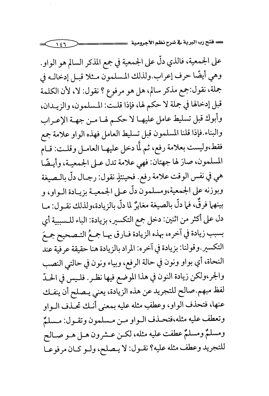 على الجمعية، فالذي دلّ على الجمعية في جمع المذكر السالم هو الواو. وهي أيضًا حرف إعراب. ولذلك المسلمون مثلا قبل إدخاله في جملة، نقول: جمع مذكر سالم، هل هو مرفوع؟ نقول: لا، لأن الكلمة قبل إدخالها في جملة لا حكم لها، فإذا قلت: المسلمون، والزيدان، وأبوك قبل تسليط عامل عليها لا حكم لها من جهة الإعراب والبناء. فإذا قلنا المسلمون قبل تسليط العامل فهذه الواو علامة جمع فقط، وليست بعلامة رفع، ثم لمَّا دخل عليها العامل وقلت: قام المسلمون، صارَ لها جهتان: فهي علامة تدل على الجمعية، وأيضًا هي في نفس الوقت علامة رفع. فحينئذٍ نقول: رجال دلّ بالصيغة وبوزنه على الجمعية، ومسلمون دلّ على الجمعية بزيادة الواو، وبينهما فرقٌ، فما دلّ بالصيغة مغايرٌ لما دلّ بالزيادة، ولذلك نقول: ما دل على أكثر من اثنين: دخل جمع التكسير، بزيادة: الباء للسببية أي بسبب زيادة في آخره، بهذه الزيادة فارق بها جمعُ التصحيح جمعَ التكسير. وقولنا: بزيادة في آخره: المراد بالزيادة هنا حقيقة عرفية عند النحاة، أي بواو ونون في حالة الرفع، وبياء ونون في حالتي النصب والجر، ولكن زيادة النون في هذا الموضع فيها نظر. فليس في الحدّ لفظ مبهم.