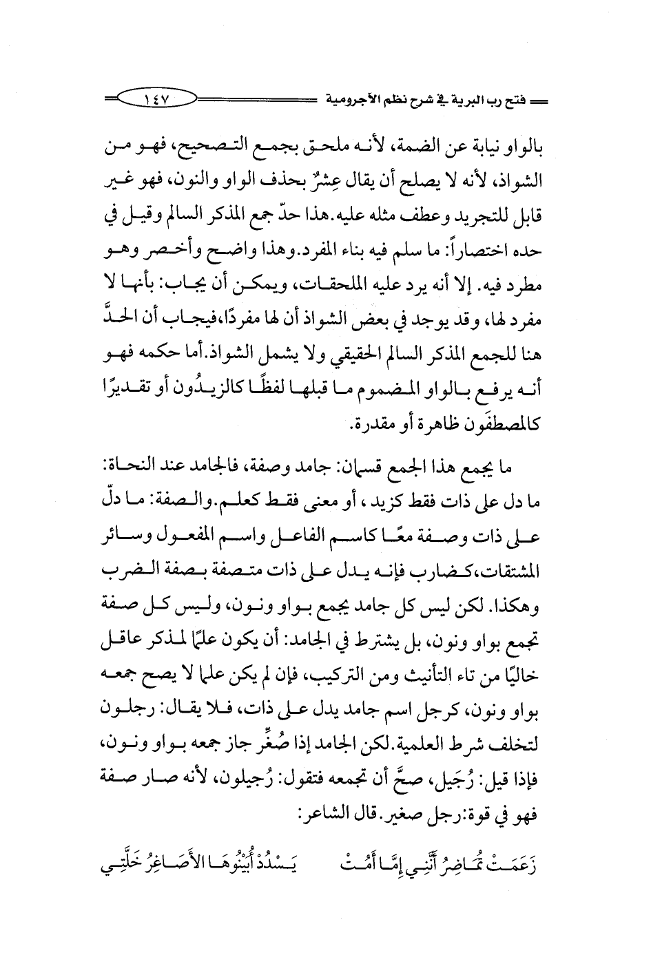ما يجمع هذا الجمع قسمان: جامد وصفة، فالجامد عند النحاة: ما دل على ذات فقط كزيد، أو معنى فقط كعلم. والصفة: ما دلّ على ذات وصفة معًا كاسم الفاعل واسم المفعول وسائر المشتقات، كضارب فإنه يدل على ذات متصفة بصفة الضرب وهكذا. لكن ليس كل جامد يجمع بواو ونون، وليس كل صفة تجمع بواو ونون، بل يشترط في الجامد: أن يكون علمًا لمذكر عاقل خاليًا من تاء التأنيث ومن التركيب، فإن لم يكن علما لا يصح جمعه بواو ونون، كرجل اسم جامد يدل على ذات، فلا يقال: رجلون لتخلف شرط العلمية. لكن الجامد إذا صُغِّر جاز جمعه بواو ونون، فإذا قيل: رُجَيل، صحَّ أن تجمعه فتقول: رُجيلون، لأنه صار صفة فهو في قوة: رجل صغير. قال الشاعر:
