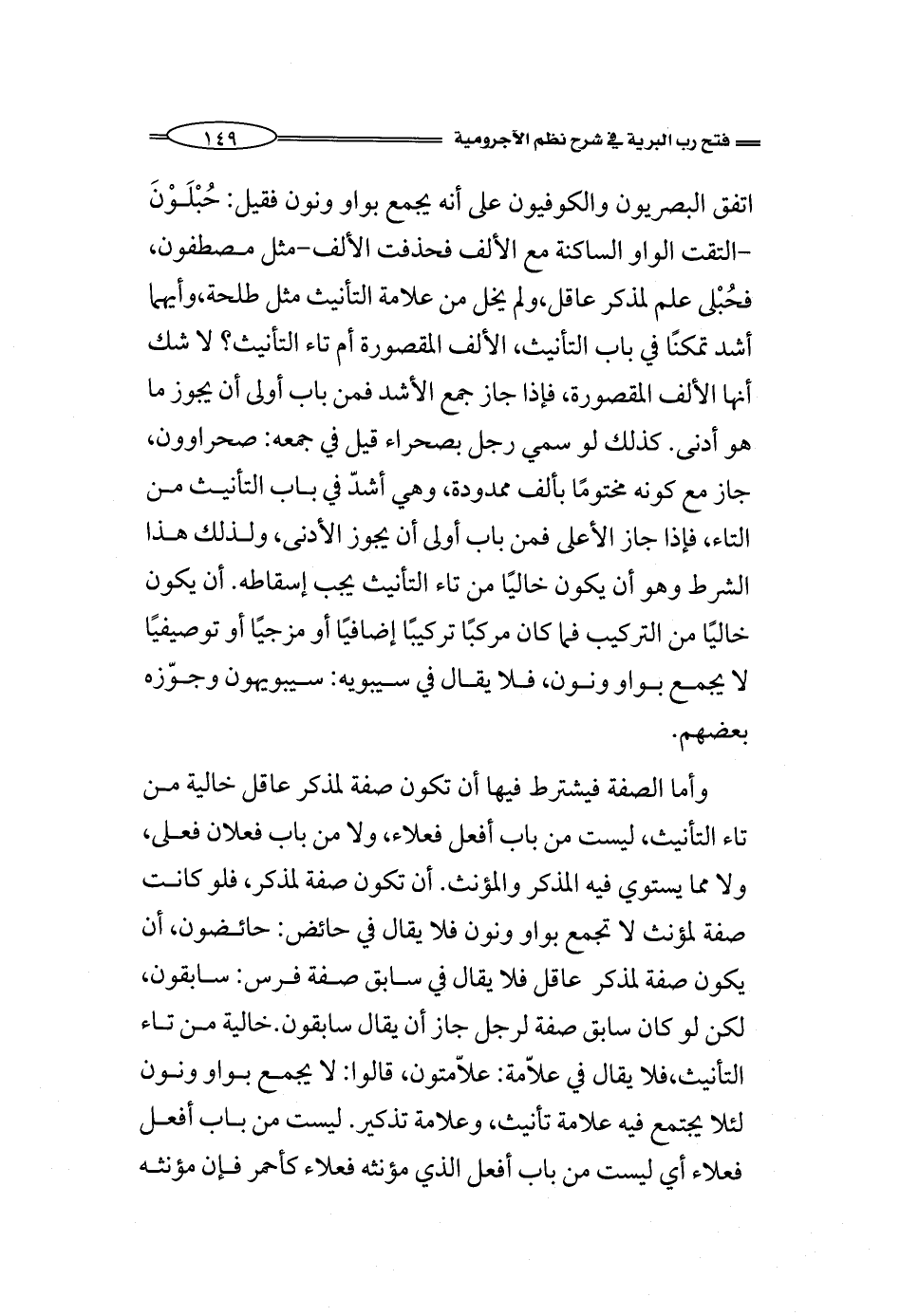 وأما الصفة فيشترط فيها أن تكون صفة لمذكر عاقل خالية من تاء التأنيث، ليست من باب أفعل فعلاء، ولا من باب فعلان فعلى، ولا مما يستوي فيه المذكر والمؤنث. أن تكون صفة لمذكر، فلو كانت صفة لمؤنث لا تجمع بواو ونون فلا يقال في حائض: حائضون، أن يكون صفة لمذكر عاقل فلا يقال في سابق صفة فرس: سابقون، لكن لو كان سابق صفة لرجل جاز أن يقال سابقون. خالية من تاء التأنيث، فلا يقال في علاّمة: علاّمتون، قالوا: لا يجمع بواو ونون لئلا يجتمع فيه علامة تأنيث، وعلامة تذكير. ليست من باب أفعل فعلاء أي ليست من باب أفعل الذي مؤنثه فعلاء كأحمر فإن مؤنثه
