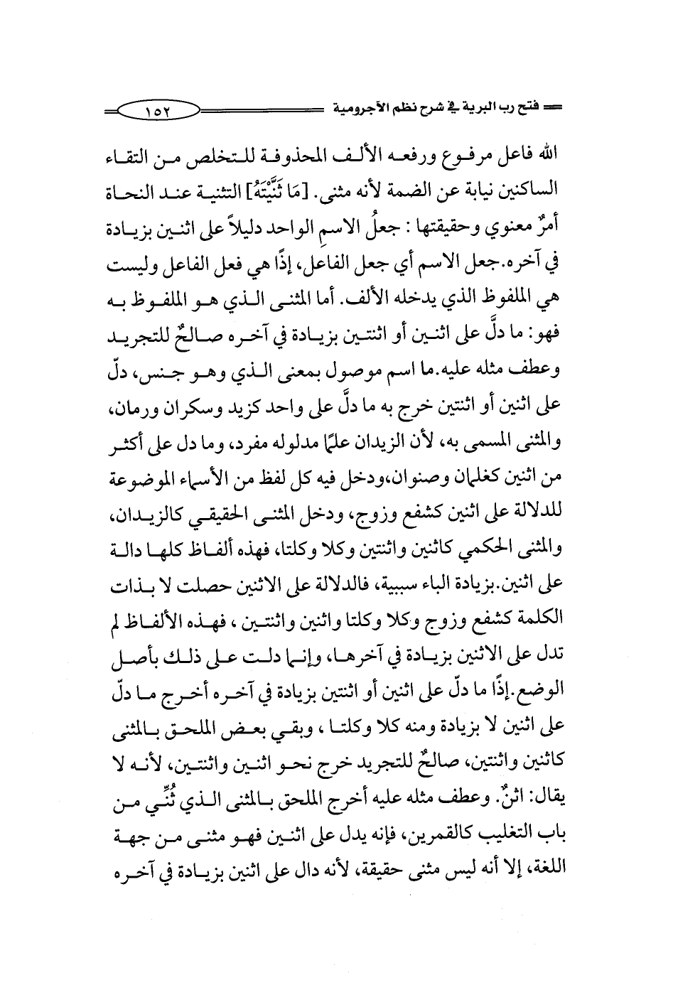 الله فاعل مرفوع ورفعه الألف المحذوفة للتخلص من التقاء الساكنان نيابة عن الضمة لأنه مثنى. [مَا ثَنَّيْتَهُ] التثنية عند النحاة أمرٌ معنوي وحقيقتها: جعلُ الاسمِ الواحد دليلاً على اثنين بزيادة في آخره. جعل الاسم أي جعل الفاعل، إذًا هي فعل الفاعل وليست هي الملفوظ الذي يدخله الألف. أما المثنى الذي هو الملفوظ به فهو: ما دلَّ على اثنين أو اثنتين بزيادة في آخره صالحٍ للتجريد وعطف مثله عليه. ما اسم موصول بمعنى الذي وهو جنس، دلّ على اثنين أو اثنتين خرج به ما دلَّ على واحد كزيد وسكران ورمان، والمثنى المسمى به، لأن الزيدان علمًا مدلوله مفرد، وما دل على أكثر من اثنين كغلمان وصنوان، ودخل فيه كل لفظ من الأسماء الموضوعة للدلالة على اثنين كشفع وزوج، ودخل المثنى الحقيقي كالزيدان، والمثنى الحكمي كاثنين واثنتين وكلا وكلتا، فهذه ألفاظ كلها دالة على اثنين. بزيادة الباء سببية، فالدلالة على الاثنين حصلت لا بذات الكلمة كشفع وزوج وكلا وكلتا واثنين واثنتين، فهذه الألفاظ لم تدل على الاثنين بزيادة في آخرها، وإنما دلت على ذلك بأصل الوضع. إذًا ما دلّ على اثنين أو اثنتين بزيادة في آخره أخرج ما دلّ على اثنين لا بزيادة ومنه كلا وكلتا، وبقي بعض الملحق بالمثنى كاثنين واثنتين، صالحٍ للتجريد خرج نحو اثنين واثنتين، لأنه لا يقال: اثنٌ.