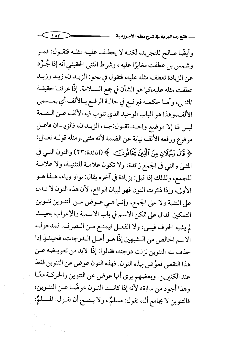 وأيضًا صالح للتجريد، لكنه لا يعطف عليه مثله فتقول: قمر وشمس عطفت مغايرًا عليه، وشرط المثنى الحقيقي أنه إذا جُرِّد عن الزيادة تعطف مثله عليه، فتقول في نحو: الزيدان، زيد وزيد عطفت مثله عليه، كما هو الشأن في جمع السلامة. إذًا عرفنا حقيقة المثنى، وأما حكمه فيرفع في حالة الرفع بالألف أي بمسمى الألف، وهذا هو الباب الوحيد الذي تنوب فيه الألف عن الضمة ليس لها إلا موضع واحد. تقول: جاء الزيدان، فالزيدان فاعل مرفوع ورفعه الألف نيابة عن الضمة لأنه مثنى. ومثله قوله تعالى: {قَالَ رَجُلانِ مِنَ الَّذِينَ يَخَافُونَ} (المائدة:23) والنون التي في المثنى والتي في الجمع زائدة، ولا تكون علامة للتثنية، ولا علامة للجمع، ولذلك إذا قيل: بزيادة في آخره يقال: بواو وياء، هذا هو الأولى، وإذا ذكرت النون فهو لبيان الواقع، لأن هذه النون لا تدل على التثنية ولا على الجمع، وإنما هي عوض عن التنوين تنوين التمكين الدال على تمكن الاسم في باب الاسمية والإعراب بحيث لم يشبه الحرف فيبنى، ولا الفعل فيمنع من الصرف. فمدخوله الاسم الخالص من الشبهين إذًا هو أعلى الدرجات، فحينئذٍ إذا حذف منه التنوين نزلت درجته، فقالوا: إذًا لابد من تعويضه عن هذا النقص فعوِّض بهذه النون. فهذه النون عوض عن التنوين فقط عند الكثيرين. وبعضهم يرى أنها عوض عن التنوين والحركة معًا وهذا أجود من سابقه لأنه إذا كانت النون عوضًا عن التنوين، فالتنوين لا يجامع أل، تقول: مسلمٌ، ولا يصح أن تقول: المسلمٌ،