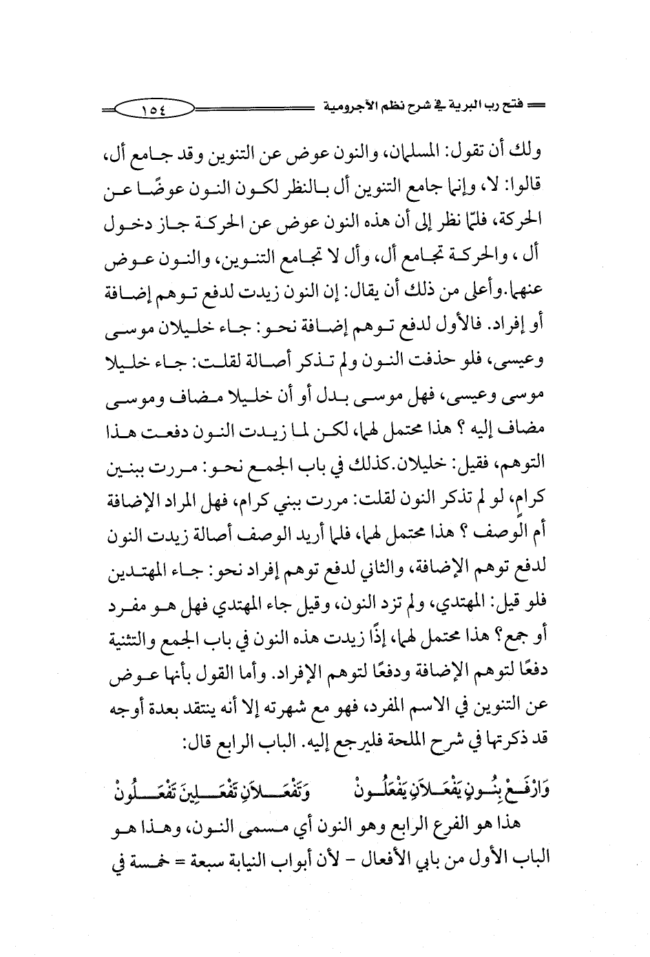 ولك أن تقول: المسلمان، والنون عوض عن التنوين وقد جامع أل، قالوا: لا، وإنما جامع التنوين أل بالنظر لكون النون عوضًا عن الحركة، فلمّا نظر إلى أن هذه النون عوض عن الحركة جاز دخول أل، والحركة تجامع أل، وأل لا تجامع التنوين، والنون عوض عنهما. وأعلى من ذلك أن يقال: إن النون زيدت لدفع توهم إضافة أو إفراد. زيدت لدفع توهم نحو: جاء خليلان موسى وعيسى، فلو حذفت النون ولم تذكر أصالة لقلت: جاء خليلا موسى وعيسى، فهل موسى بدل أو أن خليلا مضاف وموسى مضاف إليه؟ هذا محتمل لهما، لكن لما زيدت النون دفعت هذا التوهم، فقيل: خليلان. كذلك في باب الجمع نحو: مررت ببنين كرامٍ، لو لم تذكر النون لقلت: مررت ببني كرام، فهل المراد الإضافة أم الوصف؟ هذا محتمل لهما، فلما أريد الوصف أصالة زيدت النون لتدفع توهم الإضافة، أما في الإفراد فنحو: جاء المهتدين فلو قيل: المهتدي، ولم تزد النون، وقيل جاء المهتدي فهل هو مفرد أو جمع؟ هذا محتمل لهما، إذًا زيدت هذه النون في باب الجمع والتثنية دفعًا لتوهم الإضافة ودفعًا لتوهم الإفراد. وأما القول بأنها عوض عن التنوين في الاسم المفرد، فهو مع شهرته إلا أنه ينتقد بعدة أوجه قد ذكرتها في شرح الملحة فليرجع إليه. الباب الرابع قال: