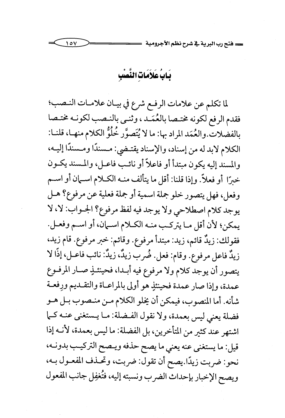 لما تكلم عن علامات الرفع شرع في بيان علامات النصب؛ فقدم الرفع لكونه مختصا بالعُمَد، وثنى بالنصب لكونه مختصا بالفضلات. والعُمَد المراد بها: ما لا يُتَصوَّر خُلُوُّ الكلام منها، قلنا: الكلام لابد له من إسناد، والإسناد يقتضي: مسندًا ومسندًا إليه، والمسند إليه يكون مبتدأ أو فاعلاً أو نائب فاعل، والمسند يكون خبرًا أو فعلاً. وإذا قلنا: أقل ما يتألف منه الكلام اسمان أو اسم وفعل، فهل يتصور خلو جملة اسمية أو جملة فعلية عن مرفوع؟ هل يوجد كلام اصطلاحي ولا يوجد فيه لفظ مرفوع؟ الجواب: لا، لا يمكن؛ لأن أقل ما يتركب منه الكلام اسمان، أو اسم وفعل. فقولك: زيدٌ قائم، زيد: مبتدأ مرفوع. وقائم: خبر مرفوع. قام زيد، زيدٌ فاعل مرفوع. وقام: فعل. ضُرب زيدٌ، زيدٌ: نائب فاعل، إذًا لا يتصور أن يوجد كلام ولا مرفوع فيه أبدا، فحينئذٍ صار المرفوع عمدة، وإذا صار عمدة حينئذٍ هو أولى بالمراعاة والتقديم ورِفعة شأنه. أما المنصوب، فيمكن أن يخلو الكلام من منصوب بل هو فضلة يعني ليس بعمدة، ولا نقول الفضلة: ما يستغنى عنه كما اشتهر عند كثير من المتأخرين، بل الفضلة: ما ليس بعمدة، لأنه إذا قيل: ما يستغنى عنه يعني ما يصح حذفه ويصح التركيب بدونه، نحو: ضربت زيدًا. يصح أن تقول: ضربت، وتحذف المفعول به، ويصح الإخبار بإحداث الضرب ونسبته إليه، فتُغفِل جانب المفعول
