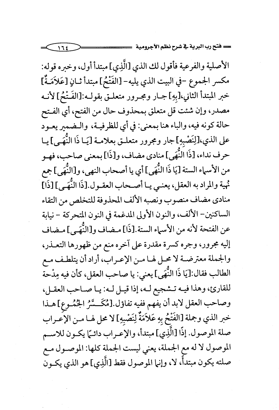 الأصلية والفرعية فأقول لك الذي [الَّذِي] مبتدأ أول، وخبره قوله: مكسر الجموع -في البيت الذي يليه-[الفَتْحُ] مبتدأ ثانٍ [عَلاَمَةٌ] خبر المبتدأ الثاني، [بِهِ] جار ومجرور متعلق بقوله: [الفَتْحُ] لأنه مصدر، وإن شئت قل متعلق بمحذوف حال من الفتح، أي الفتح حالة كونه فيه، والباء هنا بمعنى: في أي للظرفية، والضمير يعود على الذي، [لِنَصْبِهِ] جار ومجرور متعلق بعلامة [يَا ذَا النُّهَى] يا حرف نداء، [ذَا النُّهَى] منادى مضاف، و [ذَا] بمعنى صاحب، فهو من الأسماء الستة [يَا ذَا النُّهَى] أي يا أصحاب النهى، و [النُّهَى] جمع نُهية والمراد به العقل، يعني يا أصحاب العقول. [ذَا النُّهَى] [ذَا] منادى مضاف منصوب ونصبه الألف المحذوفة للتخلص من التقاء الساكنين- الألف، والنون الأولى المدغمة في النون المتحركة - نيابة عن الفتحة لأنه من الأسماء الستة. [ذَا] مضاف [النُّهَى] مضاف إليه مجرور، وجره كسرة مقدرة على آخره منع من ظهورها التعذر، والجملة معترضة لا محل لها من الإعراب، أراد أن يتلطف مع الطالب فقال: [يَا ذَا النُّهَى] يعني: يا صاحب العقل، كأن فيه مِدْحة للقارئ، وهذا فيه تشجيع له، إذا قيل له: يا صاحب العقل، وصاحب العقل لابد أن يفهم ففيه تفاؤل. [مُكَسَّرُ الجُمُوعِ] هذا خبر الذي وجملة [الفَتْحُ بِهِ عَلاَمَةٌ لِنَصْبِهِ] لا محل لها من الإعراب صلة الموصول. إذًا [الَّذِي] مبتدأ، والإعراب دائمًا يكون للاسم الموصول لا له مع الجملة، يعني ليست الجملة كلها: الموصول مع صلته يكون مبتدأً، لا، وإنما الموصول فقط [الَّذِي] هو الذي يكون