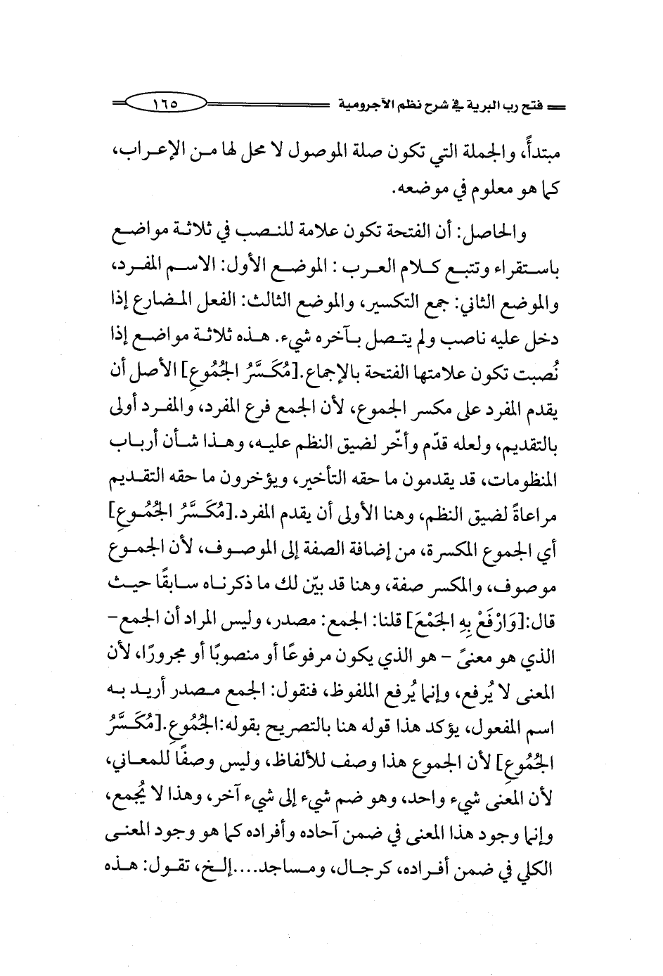 والحاصل: أن الفتحة تكون علامة للنصب في ثلاثة مواضع باستقراء وتتبع كلام العرب: الموضع الأول: الاسم المفرد، والموضع الثاني: جمع التكسير، والموضع الثالث: الفعل المضارع إذا دخل عليه ناصب ولم يتصل بآخره شيء. هذه ثلاثة مواضع إذا نُصبت تكون علامتها الفتحة بالإجماع. [مُكَسَّرُ الجُمُوعِ] الأصل أن يقدم المفرد على مكسر الجموع، لأن الجمع فرع المفرد، والمفرد أولى بالتقديم، ولعله قدّم وأخّر لضيق النظم عليه، وهذا شأن أرباب المنظومات، قد يقدمون ما حقه التأخير، ويؤخرون ما حقه التقديم مراعاةً لضيق النظم، وهنا الأولى أن يقدم المفرد. [مُكَسَّرُ الجُمُوعِ] أي الجموع المكسرة، من إضافة الصفة إلى الموصوف، لأن الجموع موصوف، والمكسر هذا صفة، وهنا قد بيّن لك ما ذكرناه سابقًا حيث قال: [وَارْفَعْ بِهِ الجَمْعَ] قلنا: الجمع: مصدر، وليس المراد أن الجمع- الذي هو معنىً - هو الذي يكون مرفوعًا أو منصوبًا أو مجرورًا، لأن المعنى لا يُرفع، وإنما يُرفع الملفوظ، فنقول: الجمع مصدر أريد به اسم المفعول، يؤكد هذا قوله هنا بالتصريح بقوله: الجُمُوعِ. [مُكَسَّرُ الجُمُوعِ] لأن الجموع هذا وصف للألفاظ، وليس وصفًا للمعاني، لأن المعنى شيء واحد، وهو ضم شيء إلى شيء آخر، وهذا لا يُجمع، وإنما وجود هذا المعنى في ضمن آحاده وأفراده كما هو وجود المعنى الكلي في ضمن أفراده، كرجال، ومساجد .... إلخ، تقول: هذه