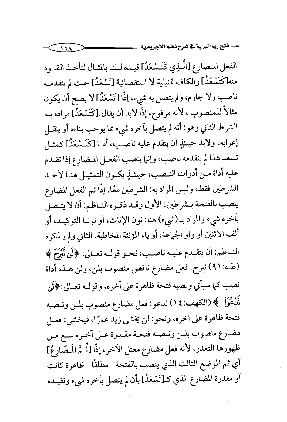 الفعل المضارع [الَّذِي كَتَسْعَدُ] قيده لك بالمثال لتأخذ القيود منه [كَتَسْعَدُ] والكاف تمثيلية لا استقصائية [تَسْعَدُ] حيث لم يتقدمه ناصب ولا جازم، ولم يتصل به شيء، إذًا [تَسْعَدُ] لا يصح أن يكون مثالاً للمنصوب، لأنه مرفوع، إذًا لابد أن يقال: [كَتَسْعَدُ] مراده به الشرط الثاني وهو: أنه لم يتصل بآخره شيء مما يوجب بناءه أو ينقل إعرابه، ولابد حينئذٍ أن يتقدم عليه ناصب، أما [كَتَسْعَدُ] كمثل تسعد هذا لم يتقدمه ناصب، وإنما ينصب الفعل المضارع إذا تقدم عليه أداة من أدوات النصب، حينئذٍ يكون التمثيل هنا لأحد الشرطين فقط، وليس المراد به: الشرطين معًا. إذًا ثم الفعل المضارع ينصب بالفتحة بشرطين: الأول وقد ذكره الناظم: أن لا يتصل بآخره شيء والمراد بـ (شيء) هنا: نون الإناث، أو نوني التوكيد، أو ألف الاثنين أو واو الجماعة، أو ياء المؤنثة المخاطبة. الثاني ولم يذكره الناظم: أن يتقدم عليه ناصب، نحو: {لَنْ نَبْرَحَ} (طه:91) نبرح: فعل مضارع ناقص منصوب بلن، ولن هذه أداة نصب كما سيأتي ونصبه فتحة ظاهرة على آخره، {لَنْ نَدْعُوَ} (الكهف:14) ندعو: فعل مضارع منصوب بلن ونصبه فتحة ظاهرة على آخره، ونحو: لن يخشى زيد عمرًا، فيخشى: فعل مضارع منصوب بلن ونصبه فتحة مقدرة على آخره منع من ظهورها التعذر، لأنه فعل مضارع معتل الآخر، إذًا [ثُمَّ المُضَارِعُ] أي ثم الموضع الثالث الذي ينصب بالفتحة -مطلقًا- ظاهرة كانت أو مقدرة المضارع الذي كـ[تَسْعَدُ] بأن لم يتصل بآخره شيء ونقيده