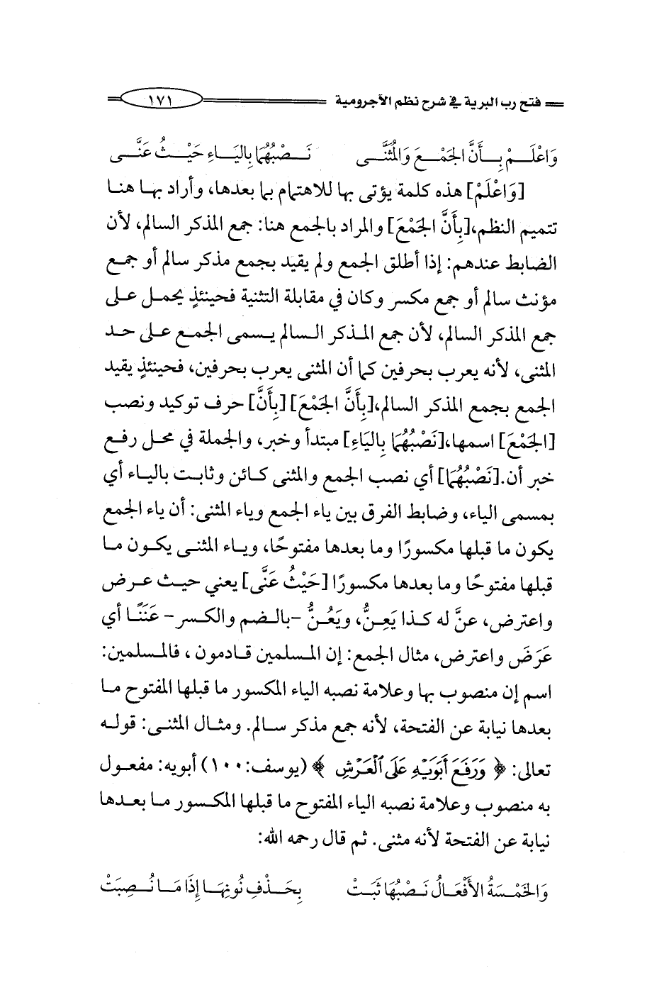 [وَاعْلَمْ] هذه كلمة يؤتى بها للاهتمام بما بعدها، وأراد بها هنا تتميم النظم، [بِأَنَّ الجَمْعَ] والمراد بالجمع هنا: جمع المذكر السالم، لأن الضابط عندهم: إذا أطلق الجمع ولم يقيد بجمع مذكر سالم أو جمع مؤنث سالم أو جمع مكسر وكان في مقابلة التثنية فحينئذٍ يحمل على جمع المذكر السالم، لأن جمع المذكر السالم يسمى الجمع على حد المثنى، لأنه يعرب بحرفين كما أن المثنى يعرب بحرفين، فحينئذٍ يقيد الجمع بجمع المذكر السالم، [بِأَنَّ الجَمْعَ] [بِأَنَّ] حرف توكيد ونصب [الجَمْعَ] اسمها، [نَصْبُهُمَا بِاليَاءِ] مبتدأ وخبر، والجملة في محل رفع خبر أن. [نَصْبُهُمَا] أي نصب الجمع والمثنى كائن وثابت بالياء أي بمسمى الياء، وضابط الفرق بين ياء الجمع وياء المثنى: أن ياء الجمع يكون ما قبلها مكسورًا وما بعدها مفتوحًا، وياء المثنى يكون ما قبلها مفتوحًا وما بعدها مكسورًا [حَيْثُ عَنَّى] يعني حيث عرض واعترض، عنَّ له كذا يَعِنُّ، ويَعُنُّ -بالضم والكسر- عَنَنًا أي عَرَضَ واعترض، مثال الجمع: إن المسلمين قادمون، فالمسلمين: اسم إن منصوب بها وعلامة نصبه الياء المكسور ما قبلها المفتوح ما بعدها نيابة عن الفتحة، لأنه جمع مذكر سالم. ومثال المثنى: قوله {وَرَفَعَ أَبَوَيْهِ عَلَى الْعَرْشِ} (يوسف:100) أبويه: مفعول به منصوب وعلامة نصبه الياء المفتوح ما قبلها المكسور ما بعدها نيابة عن الفتحة لأنه مثنى. ثم قال رحمه الله: