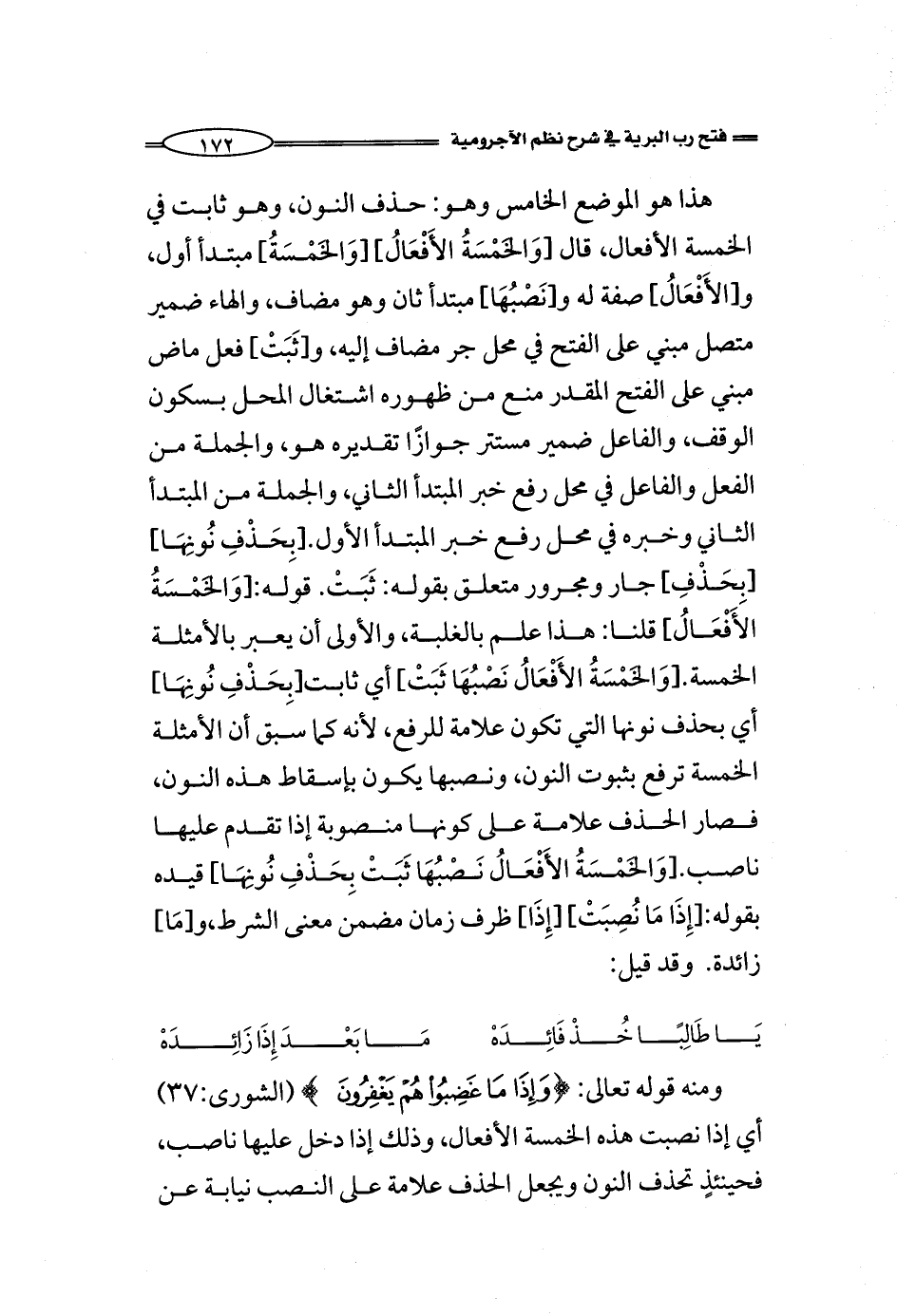 هذا هو الموضع الخامس وهو: حذف النون، وهو ثابت في الخمسة الأفعال، قال [وَالخَمْسَةُ الأَفْعَالُ] [وَالخَمْسَةُ] مبتدأ أول، و [الأَفْعَالُ] صفة له و [نَصْبُهَا] مبتدأ ثان وهو مضاف، والهاء ضمير متصل مبني على الفتح في محل جر مضاف إليه، و [ثَبَتْ] فعل ماض مبني على الفتح المقدر منع من ظهوره اشتغال المحل بسكون الوقف، والفاعل ضمير مستتر جوازًا تقديره هو، والجملة من الفعل والفاعل في محل رفع خبر المبتدأ الثاني، والجملة من المبتدأ الثاني وخبره في محل رفع خبر المبتدأ الأول. [بِحَذْفِ نُونِهَا] [بِحَذْفِ] جار ومجرور متعلق بقوله: ثَبَتْ. قوله: [وَالخَمْسَةُ الأَفْعَالُ] قلنا: هذا علم بالغلبة، والأولى أن يعبر بالأمثلة الخمسة. [وَالخَمْسَةُ الأَفْعَالُ نَصْبُهَا ثَبَتْ] أي ثابت [بِحَذْفِ نُونِهَا] أي بحذف نونها التي تكون علامة للرفع، لأنه كما سبق أن الأمثلة الخمسة ترفع بثبوت النون، ونصبها يكون بإسقاط هذه النون، فصار الحذف علامة على كونها منصوبة إذا تقدم عليها ناصب. [وَالخَمْسَةُ الأَفْعَالُ نَصْبُهَا ثَبَتْ بِحَذْفِ نُونِهَا] قيده بقوله: [إِذَا مَا نُصِبَتْ] [إِذَا] ظرف زمان مضمن معنى الشرط، و [مَا] زائدة