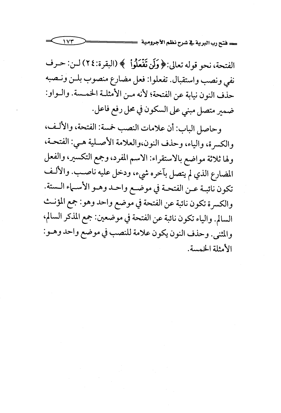 الفتحة، نحو قوله تعالى: {وَلَنْ تَفْعَلُوا} (البقرة:24) لن: حرف نفي ونصب واستقبال. تفعلوا: فعل مضارع منصوب بلن ونصبه حذف النون نيابة عن الفتحة؛ لأنه من الأمثلة الخمسة. والواو: ضمير متصل مبني على السكون في محل رفع فاعل.
