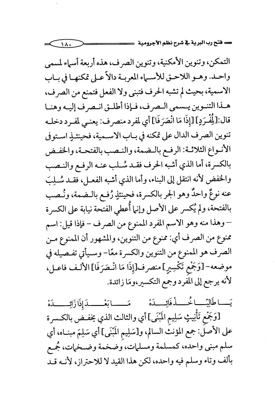 التمكن، وتنوين الأمكنية، وتنوين الصرف، هذه أربعة أسماء لمسمى واحد. وهو اللاحق للأسماء المعربة دالاً على تمكنها في باب الاسمية، بحيث لم تشبه الحرف فتبنى ولا الفعل فتمنع من الصرف، هذا التنوين يسمى الصرف، فإذا أطلق انصرف إليه هنا قال: [لِمُفْرَدٍ] [إِذَا مَا انْصَرَفَا] أي لمفرد منصرف: يعني لمفرد دخله تنوين الصرف الدال على تمكنه في باب الاسمية، فحينئذٍ استوفى الأنواع الثلاثة: الرفع بالضمة، والنصب بالفتحة، والخفض بالكسرة، أما الذي أشبه الحرف فقد سُلب عنه الرفع والنصب والخفض لأنه انتقل إلى البناء، وأما الذي أشبه الفعل، فقد سُلِبَ عنه نوعٌ واحدٌ وهو الجر بالكسرة، فحينئذٍ رُفع بالضمة، ونُصب بالفتحة، ولم يُكسر على الأصل وإنما أُعطي الفتحة نيابة على الكسرة - وهذا هو الاسم المفرد الممنوع من الصرف - فإذا قيل: اسم ممنوع من الصرف أي: ممنوع من التنوين، والمشهور أن الممنوع من الصرف هو الممنوع من التنوين والكسرة معًا- وسيأتي تفصيله في موضعه-[وَجَمْعِ تَكْسِيرٍ] منصرف [إِذَا مَا انْصَرَفَا] الألف فاعل، لأنه يرجع إلى المفرد وجمع التكسير، ومَا زائدة.