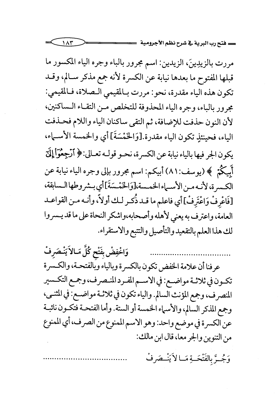 مررت بالزيدِينَ، الزيدين: اسم مجرور بالباء وجره الياء المكسور ما قبلها المفتوح ما بعدها نيابة عن الكسرة لأنه جمع مذكر سالم، وقد تكون هذه الياء مقدرة، لو قيل: مررت بالمقيمي الصلاة، فالمقيمي: مجرور بالباء، وجره الياء المحذوفة للتخلص من التقاء الساكنين، لأن النون حذفت للإضافة، ثم التقى ساكنان الياء واللام فحذفت الياء، فحينئذٍ تكون الياء مقدرة. [وَالخَمْسَةَ] أي والخمسة الأسماء، يكون الجر فيها بالياء نيابة عن الكسرة، نحو: {ارْجِعُوا إِلَى أَبِيكُمْ} (يوسف:81) أبيكم: اسم مجرور بإلى وجره الياء نيابة عن الكسرة، لأنه من الأسماء الخمسة، [وَالخَمْسَةَ] أي بشروطها السابقة, [فَاعْرِفْ وَاعْتَرِفْ] أي فاعلم ما قد ذُكر لك أولاً، وأنه من القواعد العامة، واعترف به يعني لأهله وأصحابه، واشكر النحاة على ما قد يسروا لك هذا العلم بالتقعيد والتأصيل والتتبع والاستقراء.
