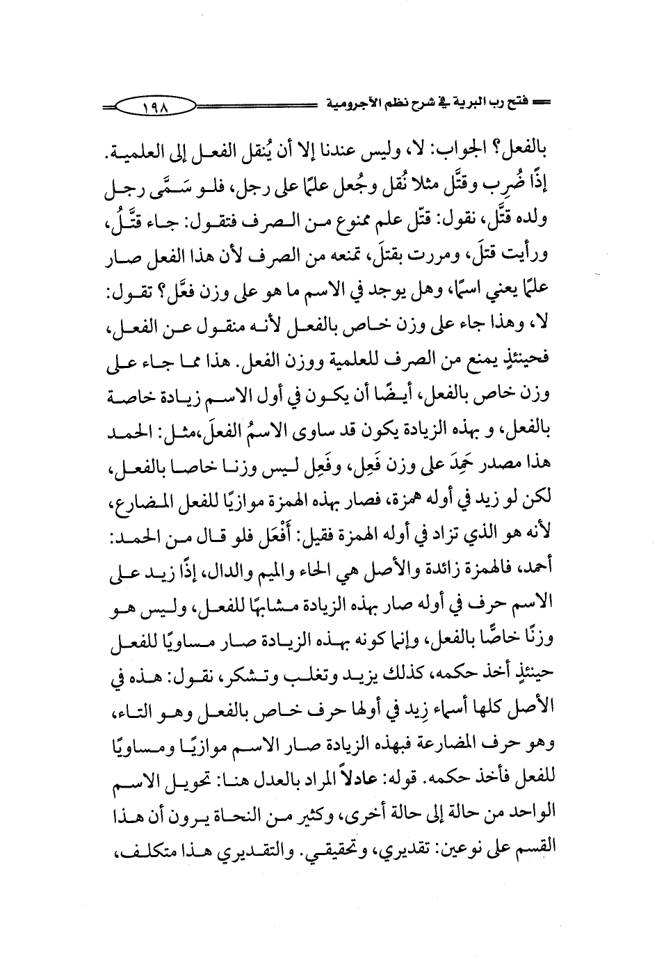 بالفعل؟ الجواب: لا، وليس عندنا إلا أن يُنقل الفعل إلى العلمية. إذًا ضُرِب وقتَّل مثلا نُقل وجُعل علمًا على رجل، فلو سَمَّى رجل ولده قتَّل، نقول: قتّل علم ممنوع من الصرف فتقول: جاء قتَّلُ، ورأيت قتلَ، ومررت بقتلَ، تمنعه من الصرف لأن هذا الفعل صار علمًا يعني اسمًا، وهل يوجد في الاسم ما هو على وزن فعَّل؟ تقول: لا، وهذا جاء على وزن خاص بالفعل لأنه منقول عن الفعل، فحينئذٍ يمنع من الصرف للعلمية ووزن الفعل. هذا مما جاء على وزن خاص بالفعل، أيضًا أن يكون في أول الاسم زيادة خاصة بالفعل، وبهذه الزيادة يكون قد ساوى الاسمُ الفعلَ، مثل: الحمد هذا مصدر حَمِدَ على وزن فَعِل، وفَعِل ليس وزنا خاصا بالفعل، لكن لو زيد في أوله همزة، فصار بهذه الهمزة موازيًا للفعل المضارع، لأنه هو الذي تزاد في أوله الهمزة فقيل: أَفْعَل فلو قال من الحمد: أحمد، فالهمزة زائدة والأصل هي الحاء والميم والدال، إذًا زيد على الاسم حرف أو زيادة في أوله صار بهذه الزيادة مشابهًا للفعل، وليس هو وزنًا خاصًّا بالفعل، وإنما كونه بهذه الزيادة صار مساويًا للفعل حينئذٍ أخذ حكمه، كذلك يزيد وتغلب وتشكر، نقول: هذه في الأصل كلها أسماء زِيد في أولها حرف خاص بالفعل وهو التاء، وهو حرف المضارعة فبهذه الزيادة صار الاسم موازيًا ومساويًا للفعل فأخذ حكمه. قوله: عادلاً المراد بالعدل هنا: تحويل الاسم الواحد من حالة إلى حالة أخرى، وكثير من النحاة يرون أن هذا القسم على نوعين: تقديري، وتحقيقي.