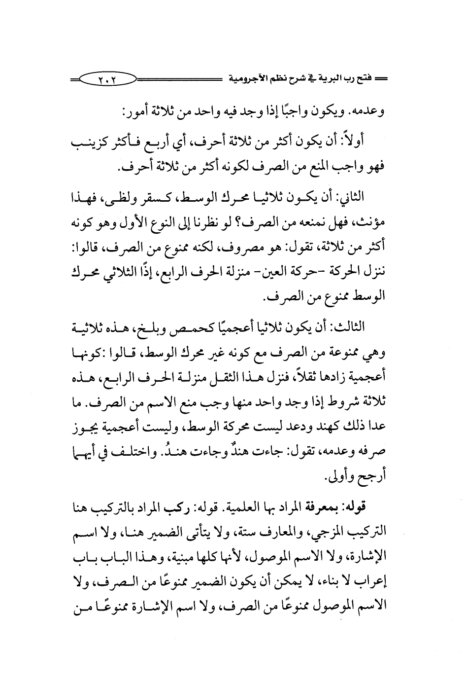 الثالث: أن يكون ثلاثيا أعجميًا كحمص وبلخ، هذه ثلاثية وهي ممنوعة من الصرف مع كونه غير محرك الوسط، قالوا: كونها أعجمية زادها ثقلاً، فنزل هذا الثقل منزلة الحرف الرابع، هذه ثلاثة شروط إذا وجد واحد منها وجب منع الاسم من الصرف. ما عدا ذلك كهند ودعد ليست محركة الوسط، وليست أعجمية يجوز صرفه وعدمه، تقول: جاءت هندٌ وجاءت هندُ. واختلف في أيهما أرجح وأولى.