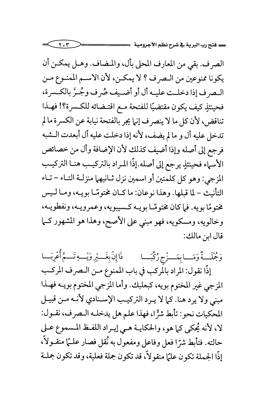 الصرف. بقي من المعارف المحلى بأل، والمضاف. وهل يمكن أن يكون ممنوعًا من الصرف؟ لا يمكن، لأن الاسم الممنوع من الصرف إذا دخلت عليه أل أو أضيف صُرف وجُرَّ بالكسرة، فحينئذٍ كيف يكون مقتضيًا للفتحة مع اقتضائه للكسرة؟! فهذا تناقض، لأن كل ما لا ينصرف إنما يجر بالفتحة نيابة عن الكسرة ما لم تدخل عليه أل وما لم يضف، لأنه إذا دخلت عليه أل أبعدت الشبه فرجع إلى أصله وإذا أضيف كذلك لأن الإضافة وأل من خصائص الأسماء فحينئذٍ يرجع إلى أصله. إذًا المراد بالتركيب هنا التركيب المزجي: وهو كل كلمتين أو اسمين نزل ثانيهما منزلة التاء - تاء التأنيث - لما قبلها. وهذا نوعان: ما كان مختومًا بويه، وما ليس مختومًا بويه. فما كان مختومًا بويه كسيبويه، وعمرويه، ونفطويه، وخالويه، ومسكويه، فهو مبني على الأصح، وهذا هو المشهور كما قال ابن مالك: