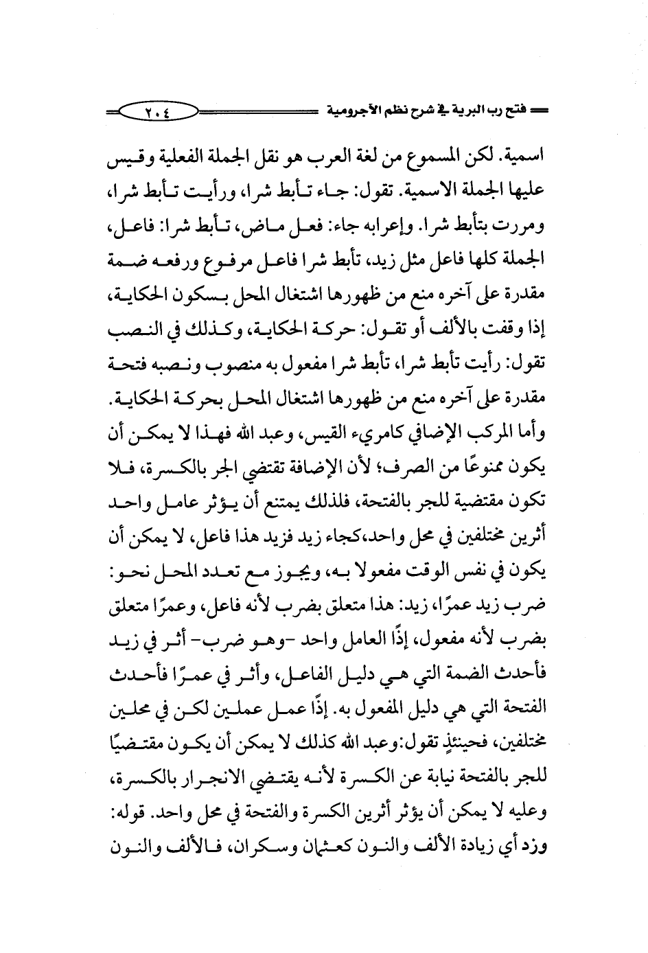 اسمية. لكن المسموع من لغة العرب هو نقل الجملة الفعلية وقيس عليها الجملة الاسمية. نقول: جاء تأبط شرا، ورأيت تأبط شرا، ومررت بتأبط شرا. وإعرابه جاء: فعل ماض، تأبط شرا: فاعل، الجملة كلها فاعل مثل زيد، تأبط شرا فاعل مرفوع ورفعه ضمة مقدرة على آخره منع من ظهورها اشتغال المحل بسكون الحكاية، إذا وقفت بالألف أو تقول: حركة الحكاية، وكذلك في النصب تقول: رأيت تأبط شرا، تأبط شرا مفعول به منصوب ونصبه فتحة مقدرة على آخره منع من ظهورها اشتغال المحل بحركة الحكاية. وأما المركب الإضافي كامريء القيس، وعبد الله فهذا لا يمكن أن يكون ممنوعًا من الصرف؛ لأن الإضافة تقتضي الجر بالكسرة، فلا تكون مقتضية للجر بالفتحة، فلذلك يمتنع أن يؤثر عامل واحد أثرين مختلفين في محل واحد، كجاء زيد فزيد هذا فاعل، لا يمكن أن يكون في نفس الوقت مفعولا به، ويجوز مع تعدد المحل نحو: ضرب زيد عمرًا، زيد: هذا متعلق بضرب لأنه فاعل، وعمرًا متعلق بضرب لأنه مفعول، إذًا العامل واحد -وهو ضرب- أثر في زيد فأحدث الضمة التي هي دليل الفاعل، وأثر في عمرًا فأحدث الفتحة التي هي دليل المفعول به. إذًا عمل عملين لكن في محلين مختلفين، فحينئذٍ تقول: وعبد الله كذلك لا يمكن أن يكون مقتضيًا للجر بالفتحة نيابة عن الكسرة لأنه يقتضي الانجرار بالكسرة، وعليه لا يمكن أن يؤثر أثرين الكسرة والفتحة في محل واحد. قوله: وزد والمراد زيادة الألف والنون كعثمان وسكران، فالألف والنون