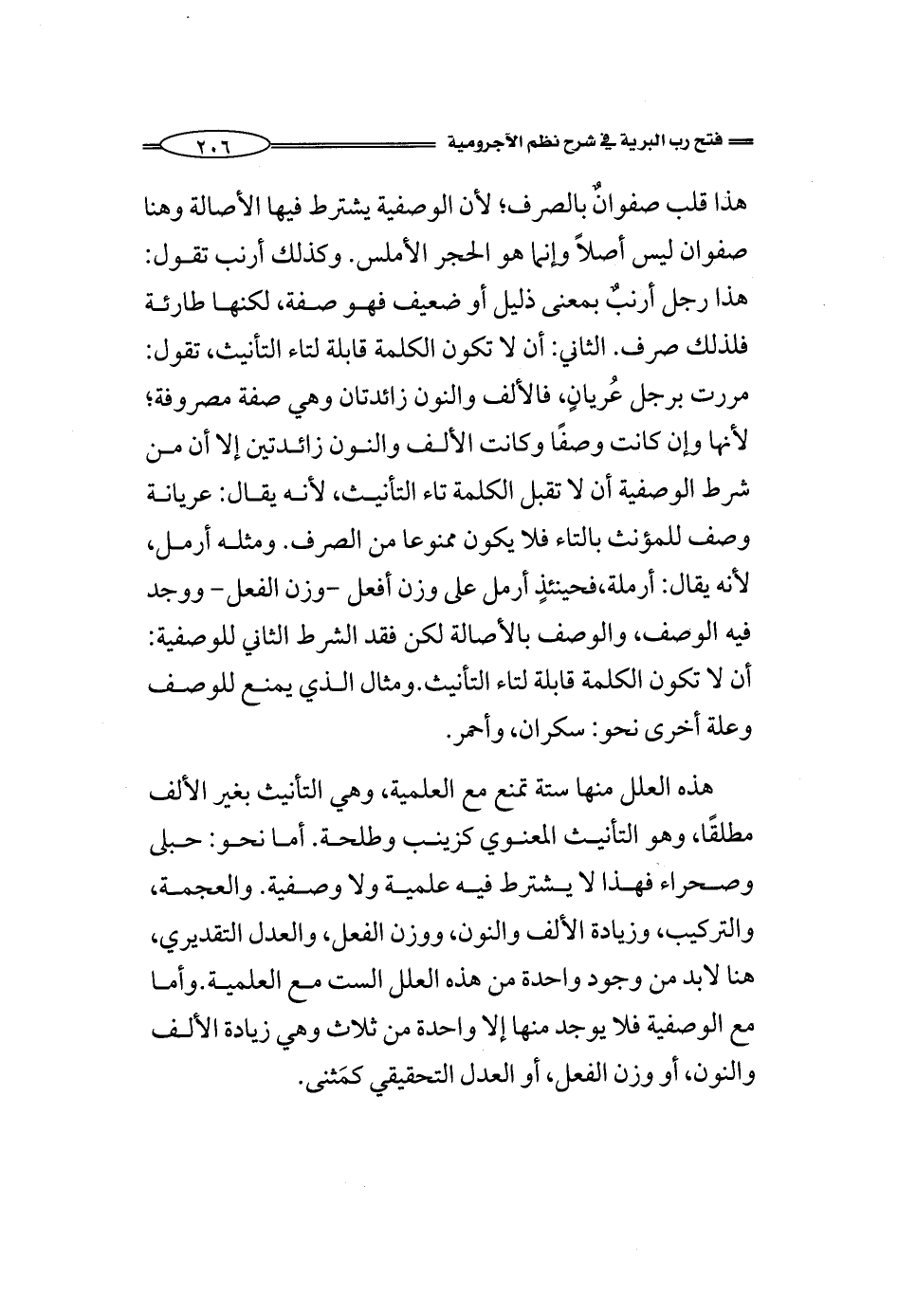 هذا قلب صفوانٌ بالصرف؛ لأن الوصفية يشترط فيها الأصالة وهنا صفوان ليس أصلاً وإنما هو الحجر الأملس. وكذلك أرنب تقول: هذا رجل أرنبٌ بمعنى ذليل أو ضعيف فهو صفة، لكنها طارئة فلذلك صرف. الثاني: أن لا تكون الكلمة قابلة لتاء التأنيث، تقول: مررت برجل عُريانٍ، فالألف والنون زائدتان وهي صفة مصروفة؛ لأنها وإن كانت وصفًا وكانت الألف والنون زائدتين إلا أن من شرط الوصفية أن لا تقبل الكلمة تاء التأنيث، لأنه يقال: عريانة وصف للمؤنث بالتاء فلا يكون ممنوعا من الصرف. ومثله أرمل، لأنه يقال: أرملة، فحينئذٍ أرمل على وزن أفعل -وزن الفعل- ووجد فيه الوصف، والوصف بالأصالة لكن فقد الشرط الثاني للوصفية: أن لا تكون الكلمة قابلة لتاء التأنيث. ومثال الذي يمنع للوصف وعلة أخرى نحو: سكران، وأحمر.