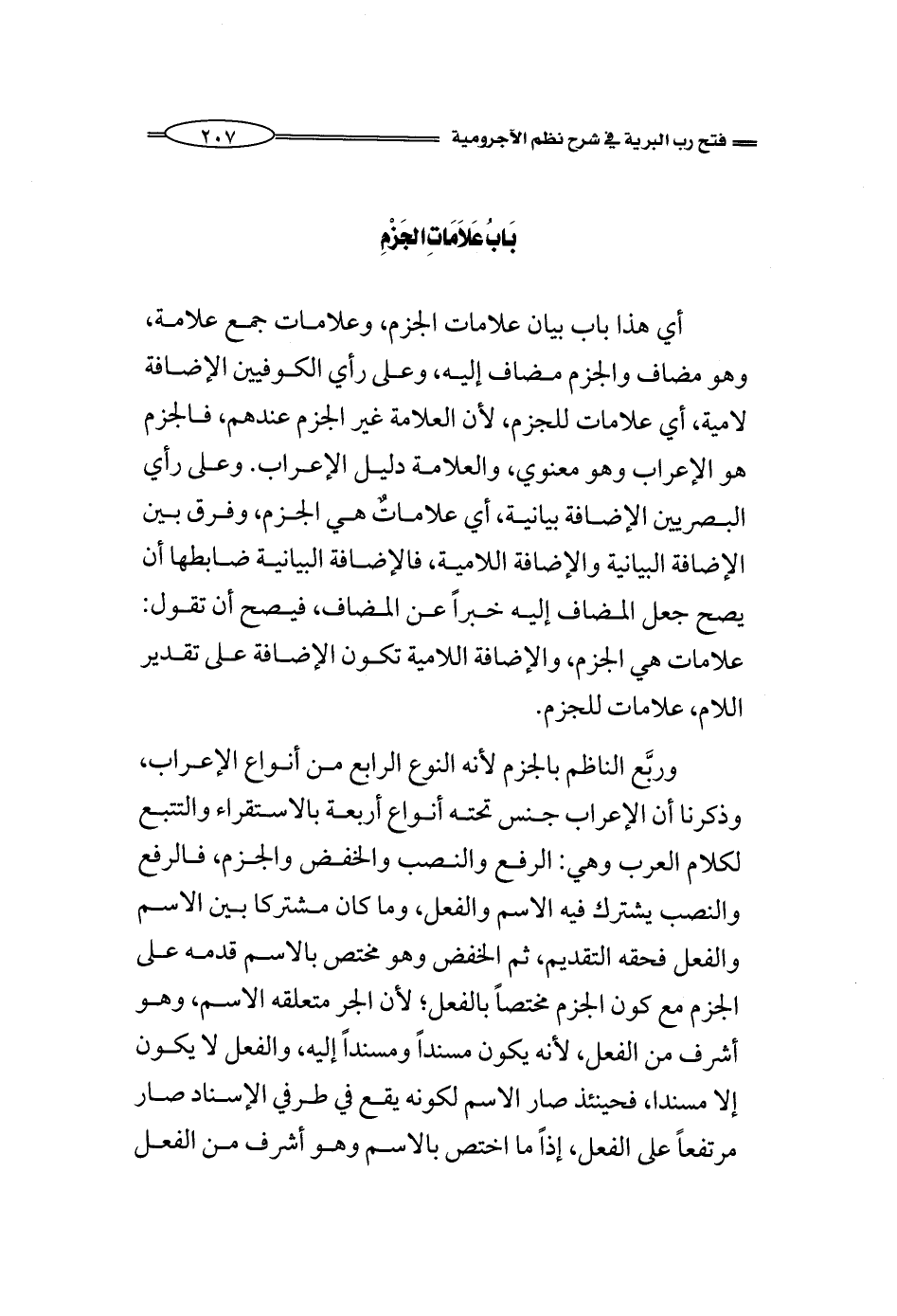 أي هذا باب بيان علامات الجزم، وعلامات جمع علامة، وهو مضاف والجزم مضاف إليه، وعلى رأي الكوفيين الإضافة لامية، أي علامات للجزم، لأن العلامة غير الجزم عندهم، الجزم هو الإعراب وهو معنوي، والعلامة دليل الإعراب. وعلى رأي البصريين الإضافة بيانية، أي علاماتٌ هي الجزم، وفرق بين الإضافة البيانية والإضافة اللامية، فالإضافة البيانية ضابطها أن يصح جعل المضاف إليه خبراً عن المضاف، فيصح أن تقول: علامات هي الجزم، والإضافة اللامية تكون الإضافة على تقدير اللام، علامات للجزم.