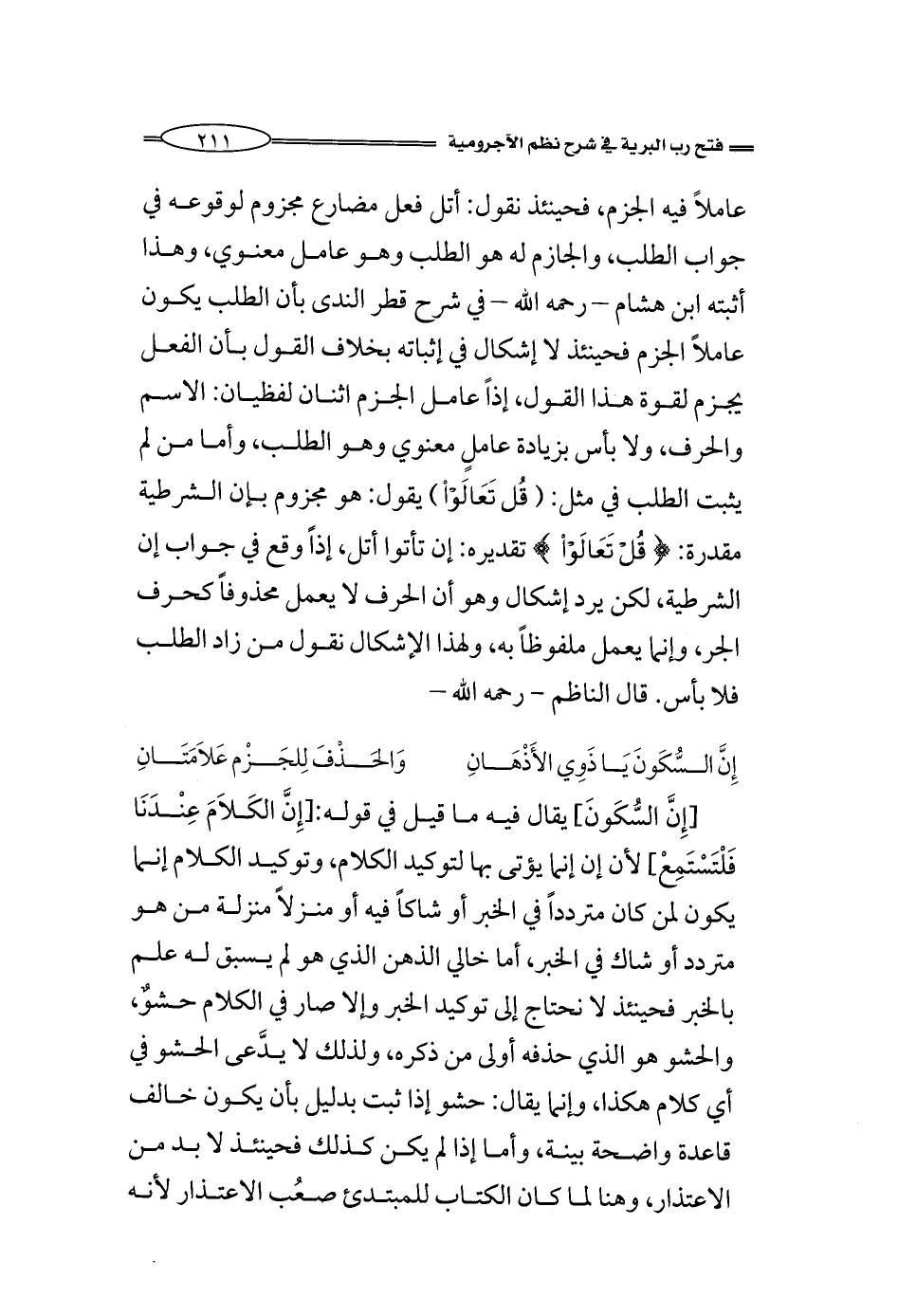 [إِنَّ السُّكَونَ] يقال فيه ما قيل في قوله: [إِنَّ الكَلاَمَ عِنْدَنَا فَلْتَسْتَمِعْ] لأن إن إنما يؤتى بها لتوكيد الكلام، وتوكيد الكلام إنما يكون لمن كان متردداً في الخبر أو شاكاً فيه أو منزلاً منزلة من هو متردد أو شاك في الخبر، أما خالي الذهن الذي هو لم يسبق له علم بالخبر فحينئذ لا نحتاج إلى توكيد الخبر وإلا صار في الكلام حشوٌ، والحشو هو الذي حذفه أولى من ذكره، ولذلك لا يدَّعى الحشو في أي كلام هكذا، وإنما يقال: حشو إذا ثبت بدليل بأن يكون خالف قاعدة واضحة بينة، وأما إذا لم يكن كذلك فحينئذ لا بد من الاعتذار، وهنا لما كان الكتاب للمبتدئ صعُب الاعتذار لأنه