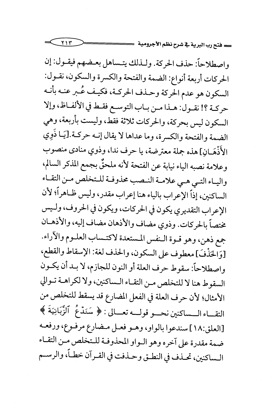واصطلاحاً: حذف الحركة. ولذلك يتساهل بعضهم فيقول: إن الحركات أربعة أنواع: الضمة والفتحة والكسرة والسكون، نقول: السكون هو عدم الحركة وحذف الحركة، فكيف عُبر عنه بأنه حركة؟! نقول: هذا من باب التوسع فقط في الألفاظ، وإلا السكون ليس بحركة، والحركات ثلاثة فقط، وليست بأربعة، وهي الضمة والفتحة والكسرة، وما عداها لا يقال إنه حركة. [يَا ذَوِي الأَذْهَانِ] هذه جملة معترضة، يا حرف ندا، وذوي منادى منصوب وعلامة نصبه الياء نيابة عن الفتحة لأنه ملحقٌ بجمع المذكر السالم، والياء التي هي علامة النصب محذوفة للتخلص من التقاء الساكنين، إذاً الإعراب بالياء هنا إعراب مقدر، وليس ظاهراً؛ لأن الإعراب التقديري يكون في الحركات، ويكون في الحروف، وليس مختصاً بالحركات. وذوي مضاف والأذهان مضاف إليه، والأذهان جمع ذهن، وهو قوة النفس المستعدة لاكتساب العلوم والآراء.