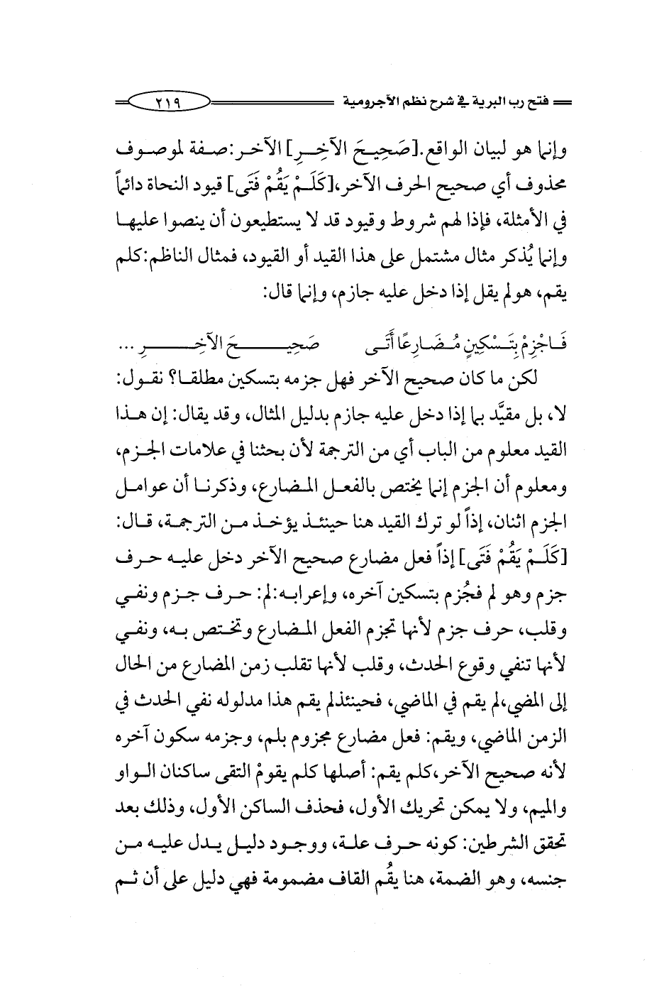 لكن ما كان صحيح الآخر فجزمه بتسكين مطلقا نقول: لا، بل مقيَّد بما إذا دخل عليه جازم بدليل المثال، وقد يقال: إن هذا القيد معلوم من الباب أي من الترجمة لأن بحثنا في علامات الجزم، ومعلوم أن الجزم إنما يختص بالفعل المضارع، وذكرنا أن عوامل الجزم اثنان، إذاً لو ترك القيد هنا حينئذ يؤخذ من الترجمة، قال: [كَلَمْ يَقُمْ فَتَى] إذاً فعل مضارع صحيح الآخر دخل عليه حرف جزم وهو لم فجُزم بتسكين آخره، وإعرابه: لم: حرف جزم ونفي وقلب، حرف جزم لأنها تجزم الفعل المضارع وتختص به، ونفي لأنها تنفي وقوع الحدث، وقلب لأنها تقلب زمن المضارع من الحال إلى المضي، لم يقم في الماضي، فحينئذلم يقم هذا مدلوله نفي الحدث في الزمن الماضي، ويقم: فعل مضارع مجزوم بلم، وجزمه سكون آخره لأنه صحيح الآخر، كلم يقم: أصلها كلم يقومْ التقى ساكنان الواو والميم، ولا يمكن تحريك الأول، فحذف الساكن الأول، وذلك بعد تحقق الشرطين: كونه حرف علة، ووجود دليل يدل عليه من جنسه، وهو الضمة، هنا يقُم القاف مضمومة فهي دليل على أن ثم