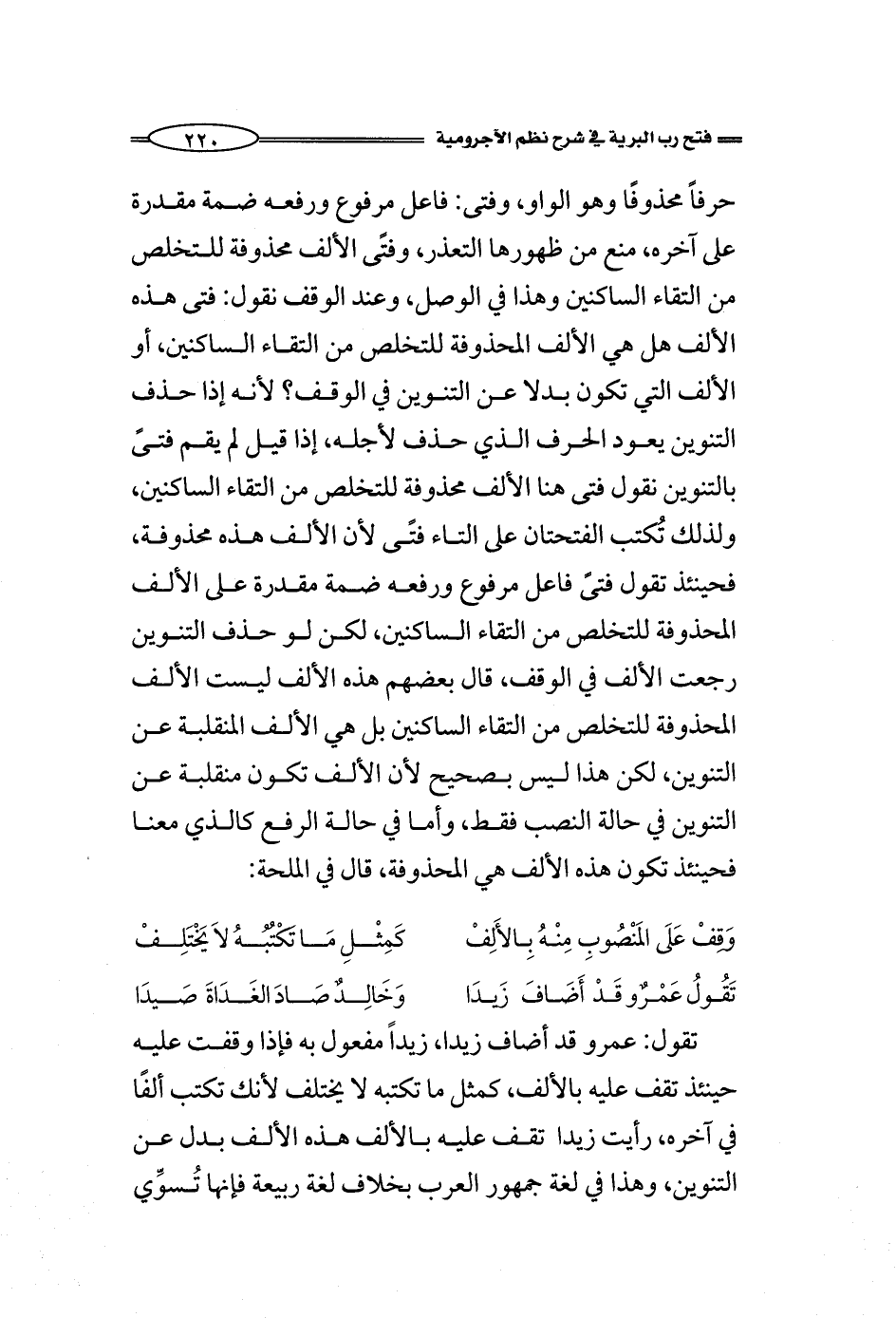 حرفاً محذوفًا وهو الواو، وفتى: فاعل مرفوع ورفعه ضمة مقدرة على آخره، منع من ظهورها التعذر، وفتًى الألف محذوفة للتخلص من التقاء الساكنين وهذا في الوصل، وعند الوقف نقول: فتى هذه الألف هل هي الألف المحذوفة للتخلص من التقاء الساكنين، أو الألف التي تكون بدلا عن التنوين في الوقف؟ لأنه إذا حذف التنوين يعود الحرف الذي حذف لأجله، إذا قيل لم يقم فتىً بالتنوين نقول فتى هنا الألف محذوفة للتخلص من التقاء الساكنين، ولذلك تُكتب الفتحتان على التاء فتىً لأن الألف هذه محذوفة، فحينئذ تقول فتىً فاعل مرفوع ورفعه ضمة مقدرة على الألف المحذوفة للتخلص من التقاء الساكنين، لكن لو حذف التنوين رجعت الألف في الوقف، قال بعضهم هذه الألف ليست الألف المحذوفة للتخلص من التقاء الساكنين بل هي الألف المنقلبة عن التنوين، لكن هذا ليس بصحيح لأن الألف تكون منقلبة عن التنوين في حالة النصب فقط، وأما في حالة الرفع كالذي معنا فحينئذ تكون هذه الألف هي المحذوفة، قال في الملحة: