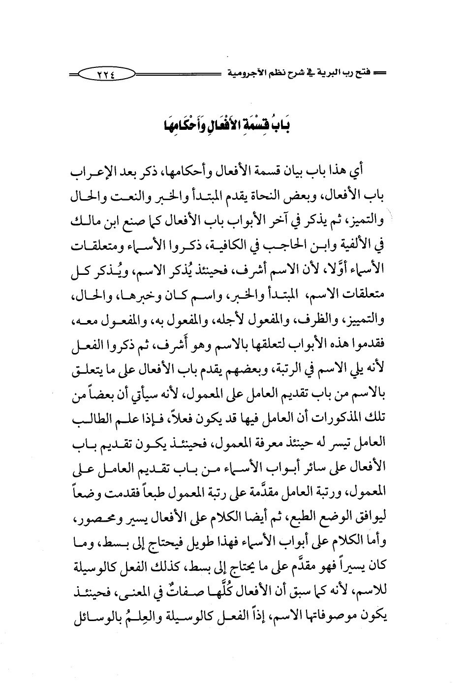 أي هذا باب بيان قسمة الأفعال وأحكامها، هنا ذكر بعد الإعراب باب الأفعال، وبعض النحاة يقدم المبتدأ والخبر والنعت والحال والتميز، ثم يذكر في آخر الأبواب باب الأفعال كما صنع ابن مالك في الألفية وابن الحاجب في الكافية، ذكروا الأسماء ومتعلقات الأسماء أوَّلا، لأن الاسم أشرف، فحينئذ يُذكر الاسم، ويُذكر كل متعلقات الاسم، المبتدأ والخبر، واسم كان وخبرها، والحال، والتمييز، والظرف، والمفعول لأجله، والمفعول به، والمفعول معه، فقدموا هذه الأبواب لتعلقها بالاسم وهو أَشرف، ثم ذكروا الفعل لأنه يلي الاسم في الرتبة، وبعضهم يقدم باب الأفعال على ما يتعلق بالاسم من باب تقديم العامل على المعمول، لأنه سيأتي أن بعضاً من تلك المذكورات أن العامل فيها قد يكون فعلاً، فإذا علم الطالب العامل تيسر له حينئذ معرفة المعمول، فحينئذ يكون تقديم باب الأفعال على سائر أبواب الأسماء من باب تقديم العامل على المعمول، ورتبة العامل مقدَّمة على رتبة المعمول طبعاً فقدمت وضعاً ليوافق الوضع الطبع، ثم أيضا الكلام على الأفعال يسير ومحصور، وأما الكلام على أبواب الأسماء فهذا طويل فيحتاج إلى بسط، وما كان يسيراً فهو مقدَّم على ما يحتاج إلى بسط، كذلك الفعل كالوسيلة للاسم، لأنه كما سبق أن الأفعال كلَّها صفاتٌ في المعنى، فحينئذ يكون موصوفاتها الاسم، إذاً الفعل كالوسيلة والعلم بالوسائل
