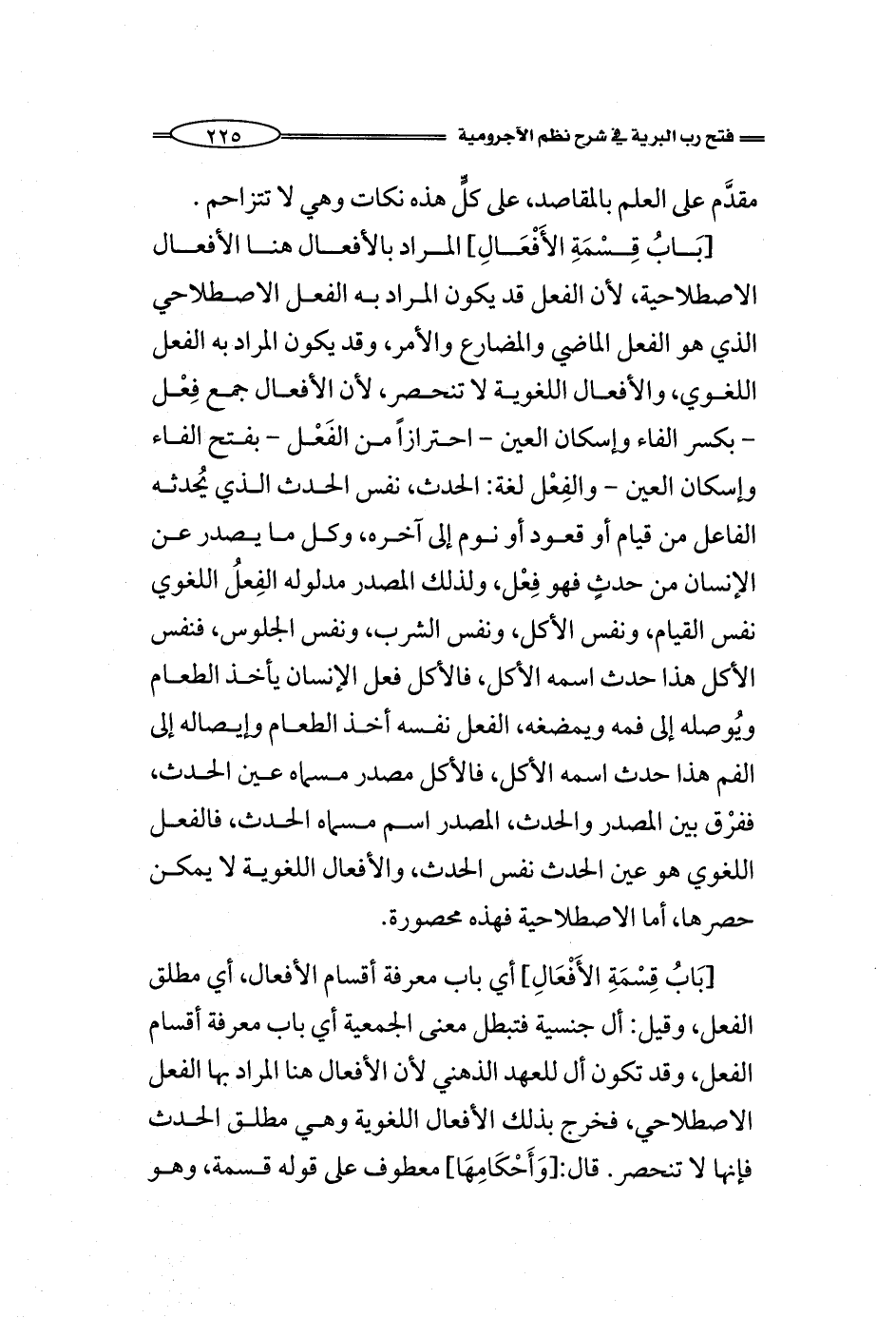 [بَابُ قِسْمَةِ الأَفْعَالِ] المراد بالأفعال هنا الأفعال الاصطلاحية، لأن الفعل قد يكون المراد به الفعل الاصطلاحي الذي هو الفعل الماضي والمضارع والأمر، وقد يكون المراد به الفعل اللغوي، والأفعال اللغوية لا تنحصر، لأن الأفعال جمع فِعْل - بكسر الفاء وإسكان العين - احترازاً من الفَعْل - بفتح الفاء وإسكان العين - والفِعْل لغة: الحدث، نفس الحدث الذي يُحدثه الفاعل من قيام أو قعود أو نوم إلى آخره، كل ما يصدر عن الإنسان من حدثٍ فهو فِعْل، ولذلك المصدر مدلوله الفِعلُ اللغوي نفس القيام، ونفس الأكل، ونفس الشرب، ونفس الجلوس، فنفس الأكل هذا حدث اسمه الأكل، فالأكل فعل الإنسان يأخذ الطعام ويُوصله إلى فمه ويمضغه، الفعل نفسه أخذ الطعام وإيصاله إلى الفم هذا حدث اسمه الأكل، فالأكل مصدر مسماه عين الحدث، ففرْق بين المصدر والحدث، المصدر اسم مسماه الحدث، فالفعل اللغوي هو عين الحدث نفس الحدث، والأفعال اللغوية لا يمكن حصرها، أما الاصطلاحية فهذه محصورة.