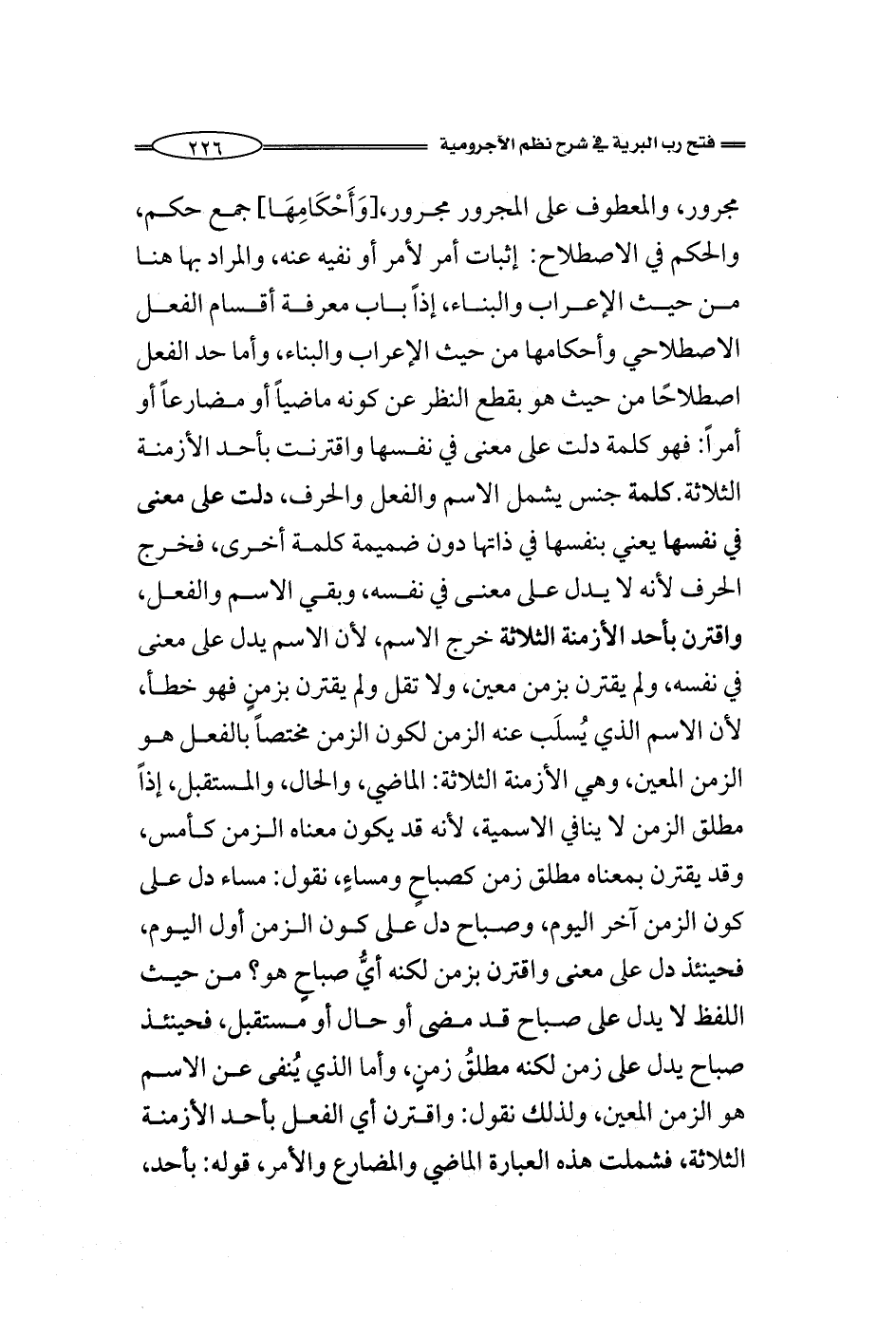 مجرور، والمعطوف على المجرور مجرور، [وَأَحْكَامِهَا] جمع حكم، والحكم في الاصطلاح: إثبات أمر لأمر أو نفيه عنه، والمراد بها هنا من حيث الإعراب والبناء، إذاً باب معرفة أقسام الفعل الاصطلاحي وأحكامها من حيث الإعراب والبناء، وأما حد الفعل اصطلاحًا من حيث هو بقطع النظر عن كونه ماضياً أو مضارعاً أو أمراً: فهو كلمة دلت على معنى في نفسها واقترنت بأحد الأزمنة الثلاثة. كلمة جنس يشمل الاسم والفعل والحرف، دلت على معنى في نفسها يعني بنفسها في ذاتها دون ضميمة كلمة أخرى، فخرج الحرف لأنه لا يدل على معنى في نفسه، وبقي الاسم والفعل، واقترن بأحد الأزمنة الثلاثة خرج الاسم، لأن الاسم يدل على معنى في نفسه، ولم يقترن بزمن معين، ولا تقل ولم يقترن بزمنٍ فهو خطأ، لأن الاسم الذي يُسلَب عنه الزمن لكون الزمن مختصاً بالفعل هو الزمن المعين، وهي الأزمنة الثلاثة: الماضي، والحال، والمستقبل، إذاً مطلق الزمن لا ينافي الاسمية، لأنه قد يكون معناه الزمن كأمس، وقد يقترن بمعناه مطلق زمن كصباحٍ ومساءٍ، نقول: مساء دل على كون الزمن آخر اليوم، وصباح دل على كون الزمن أول اليوم، فحينئذ دل على معنى واقترن بزمن لكنه أيُّ صباحٍ هو؟ من حيث اللفظ لا يدل على صباح قد مضى أو حال أو مستقبل، فحينئذ صباح يدل على زمن لكنه مطلقُ زمنٍ، وأما الذي يُنفى عن الاسم هو الزمن المعين، ولذلك نقول: واقترن أي الفعل بأحد الأزمنة الثلاثة، فشملت هذه العبارة الماضي والمضارع والأمر، قوله: بأحد،
