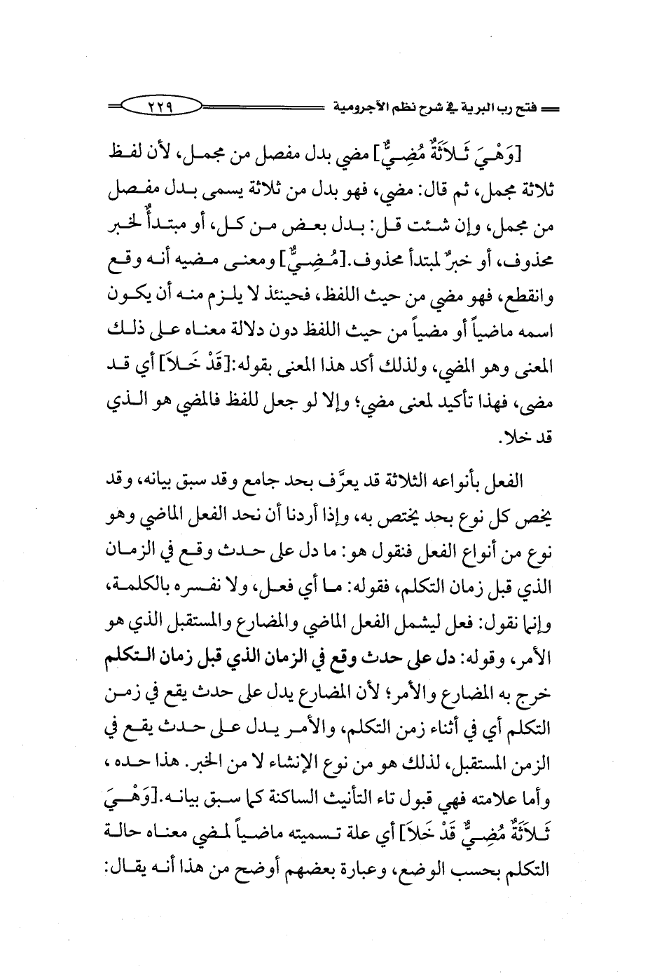 الفعل بأنواعه الثلاثة قد يعرَّف بحد جامع وقد سبق بيانه، وقد يخص كل نوع بحد يختص به، وإذا أردنا أن نحد الفعل الماضي وهو نوع من أنواع الفعل فنقول هو: ما دل على حدث وقع في الزمان الذي قبل زمان التكلم، فقوله: ما أي فعل، ولا نفسره بالكلمة، وإنما نقول: فعل ليشمل الفعل الماضي والمضارع والمستقبل الذي هو الأمر، وقوله: دل على حدث وقع في الزمان الذي قبل زمان التكلم خرج به المضارع والأمر؛ لأن المضارع يدل على حدث يقع في زمن التكلم أي في أثناء زمن التكلم، والأمر يدل على حدث يقع في الزمن المستقبل، لذلك هو من نوع الإنشاء لا من الخبر. هذا حده، وأما علامته فهي قبول تاء التأنيث الساكنة كما سبق بيانه. [وَهْيَ ثَلاَثَةٌ مُضِيٌّ قَدْ خَلاَ] أي علة تسميته ماضياً لمضي معناه حالة التكلم بحسب الوضع، وعبارة بعضهم أوضح من هذا أنه يقال:
