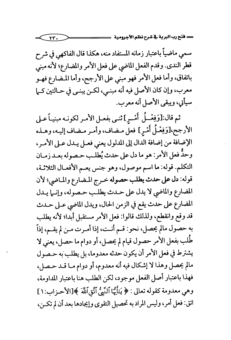 ثم قال: [وَفِعْلُ أَمْرٍ] ثنى بفعل الأمر لكونه مبنياً على الأرجح، [وَفِعْلُ أَمْرٍ] فعل مضاف، وأمر مضاف إليه، وهذه الإضافة من إضافة الدال إلى المدلول يعني فعل يدل على الأمر، وحدُّ فعل الأمر: هو ما دل على حدث يُطلب حصوله بعد زمان التكلم. قوله: ما اسم موصول، وهو جنس يعم الأفعال الثلاثة، قوله: دل على حدث يطلب حصوله خرج المضارع والماضي؛ لأن المضارع والماضي لا يدل على حدث يطلب حصوله، وإنما يدل المضارع على حدث يقع في الزمن الحال، ويدل الماضي على حدث قد وقع وانقطع، ولذلك قالوا: فعل الأمر مستقبل أبدا؛ لأنه يطلب به حصول مالم يحصل، نحو: قم أنت، إذا أمرت من لم يقم، إذاً طُلب بفعل الأمر حصول قيام لم يحصل، أو دوام ما حصل، يعني لا يشترط في فعل الأمر أن يكون حدثه معدوما، بل يطلب به حصول مالم يحصل وهذا لا إشكال فيه أنه معدوم، أو دوام ما قد حصل، فهذا باعتبار أصل الفعل موجود، لكن الطلب هنا باعتبار المداومة، وهي معدومة كقوله: ((يَا أَيُّهَاالنَّبِيُّ اتَّقِ اللَّهَ (1))) [الأحزاب:1] اتق: فعل أمر، وليس المراد به تحصيل التقوى وإيجادها بعد أن لم تكن،