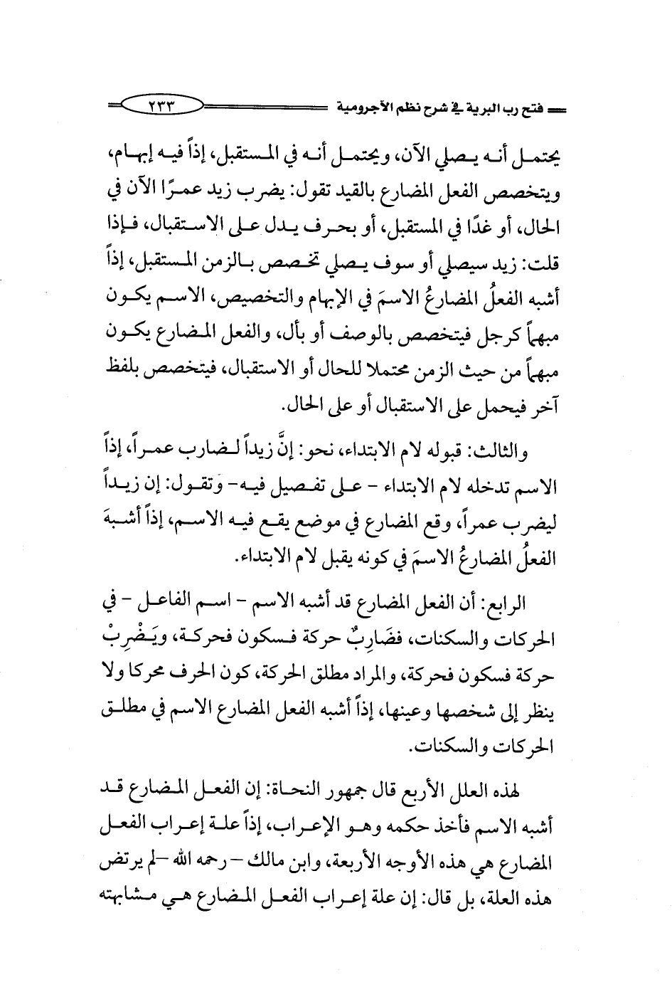 لهذه العلل الأربع قال جمهور النحاة: إن الفعل المضارع قد أشبه الاسم فأخذ حكمه وهو الإعراب، إذاً علة إعراب الفعل المضارع هي هذه الأوجه الأربعة، وابن مالك - رحمه الله -لم يرتض هذه العلة، بل قال: إن علة إعراب الفعل المضارع هي مشابهته