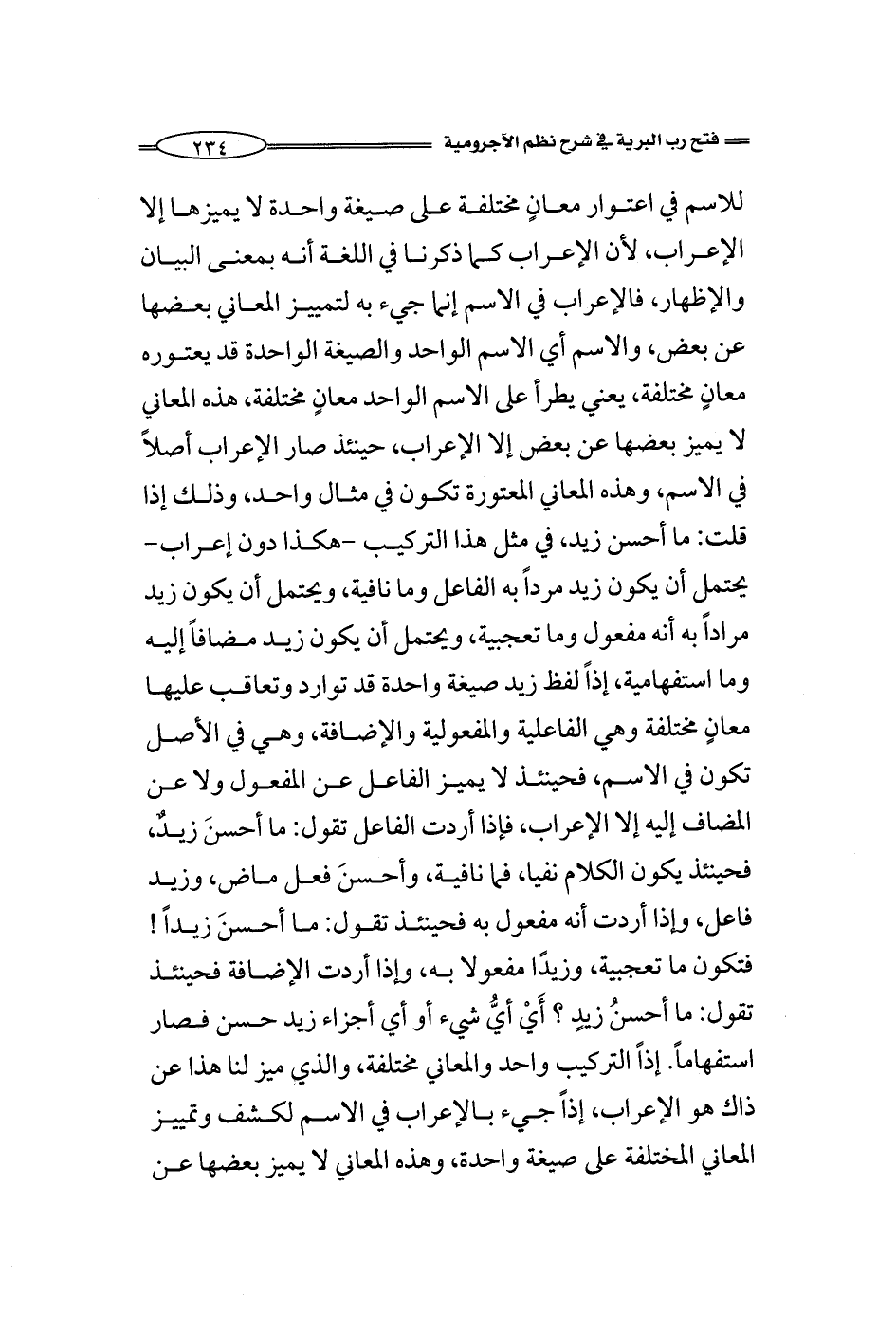 للاسم في اعتوار معاني مختلفة على صيغة واحدة لا يميزها إلا الإعراب، لأن الإعراب كما ذكرنا في اللغة أنه بمعنى البيان والإظهار، فالإعراب في الاسم إنما جيء به لتمييز المعاني بعضها عن بعض، والاسم أي الاسم الواحد والصيغة الواحدة قد يعتوره معانٍ مختلفة، يعني يطرأ على الاسم الواحد معانٍ مختلفة، هذه المعاني لا يميز بعضها عن بعض إلا الإعراب، حينئذ صار الإعراب أصلاً في الاسم، وهذه المعاني المعتورة تكون في مثال واحد، وذلك إذا قلت: ما أحسن زيد، في مثل هذا التركيب -هكذا دون إعراب- فيحتمل أن يكون زيد مرداً به الفاعل وما نافية، ويحتمل أن يكون زيد مراداً به أنه مفعول وما تعجبية، ويحتمل أن يكون زيد مضافاً إليه وما استفهامية، إذاً لفظ زيد صيغة واحدة قد توارد وتعاقب عليها معانٍ مختلفة وهي الفاعلية والمفعولية والإضافة، وهي في الأصل تكون في الاسم، فحينئذ لا يميز الفاعل عن المفعول ولا عن المضاف إليه إلا الإعراب، فإذا أردت الفاعل تقول: ما أحسنَ زيدٌ، فحينئذ يكون الكلام نفيا، فما نافية، وأحسنَ فعل ماض، وزيد فاعل، وإذا أردت أنه مفعول به فحينئذ تقول: ما أحسنَ زيداً! فتكون ما تعجبية، وزيدًا مفعولا به، وإذا أردت الإضافة فحينئذ تقول: ما أحسنُ زيدٍ؟ أَيْ أيُّ شيء أو أي أجزاء زيد حسن فصار استفهاماً.