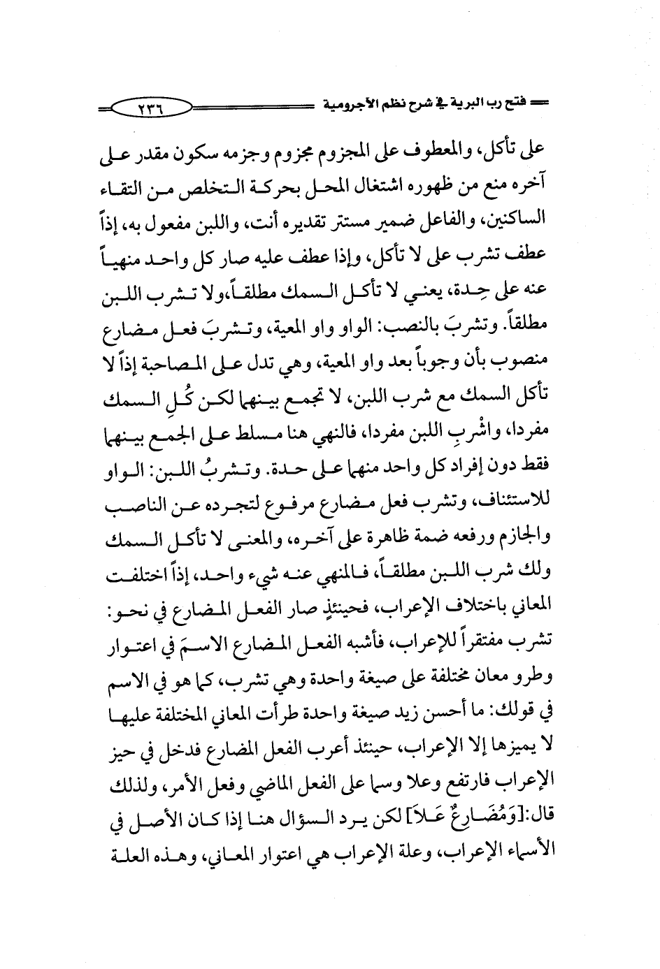 وتشربُ اللبن: الواو للاستئناف، وتشرب فعل مضارع مرفوع لتجرده عن الناصب والجازم ورفعه ضمة ظاهرة على آخره، والمعنى لا تأكل السمك ولك شرب اللبن مطلقاً، فالمنهي عنه شيء واحد، إذاً اختلفت المعاني باختلاف الإعراب، فحينئذٍ صار الفعل المضارع في نحو: تشرب مفتقراً للإعراب، فأشبه الفعل المضارع الاسمَ في اعتوار وطرو معان مختلفة على صيغة واحدة وهي تشرب، كما هو في الاسم في قولك: ما أحسن زيد صيغة واحدة طرأت المعاني المختلفة عليها لا يميزها إلا الإعراب، حينئذ أعرب الفعل المضارع فدخل في حيز الإعراب فارتفع وعلا وسما على الفعل الماضي وفعل الأمر، ولذلك قال: [وَمُضَارِعٌ عَلاَ] لكن يرد السؤال هنا إذا كان الأصل في الأسماء الإعراب، وعلة الإعراب هي اعتوار المعاني، وهذه العلة