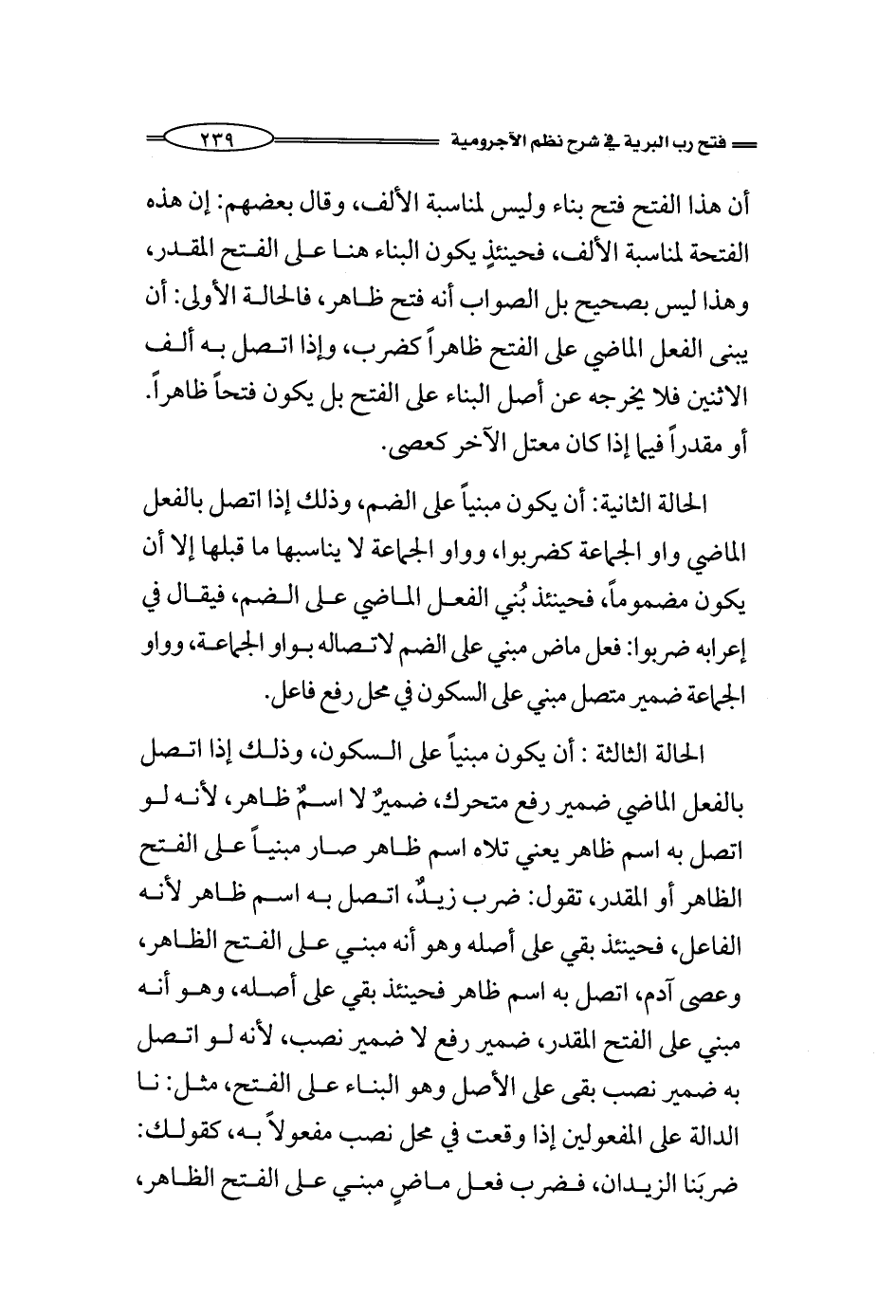 أن هذا الفتح فتح بناء وليس لمناسبة الألف، وقال بعضهم: إن هذه الفتحة لمناسبة الألف، فحينئذٍ يكون البناء هنا على الفتح المقدر، وهذا ليس بصحيح بل الصواب أنه فتح ظاهر، فالحالة الأولى: أن يبنى الفعل الماضي على الفتح ظاهراً كضرب، أو اتصل به ألف الاثنين فلا يخرجه عن أصل البناء على الفتح بل يكون فتحاً ظاهراً. أو مقدراً فيما إذا كان معتل الآخر كعصى.