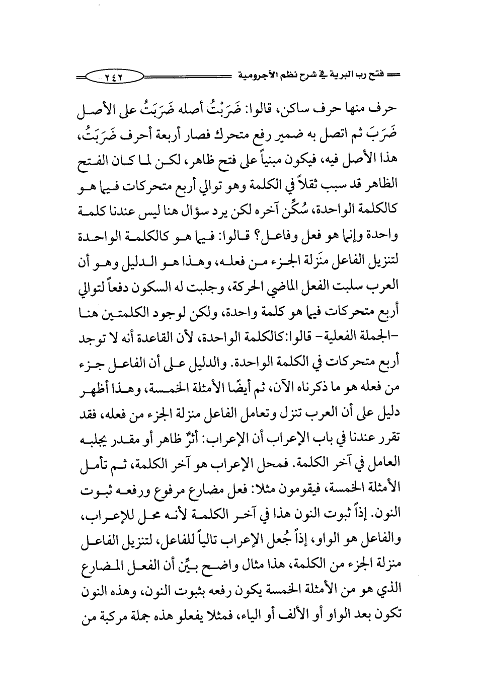 حرف منها حرف ساكن، قالوا: ضَرَبْتُ أصله ضَرَبَتُ على الأصل ضَرَبَ ثم اتصل به ضمير رفع متحرك فصار أربعة أحرف ضَرَبَتُ، هذا الأصل فيه، فيكون مبنياً على فتح ظاهر، لكن لما كان الفتح الظاهر قد سبب ثقلاً في الكلمة وهو توالي أربع متحركات فيما هو كالكلمة الواحدة، لكن يرد سؤال هنا ليس عندنا كلمة واحدة وإنما هو فعل وفاعل؟ قالوا: فيما هو كالكلمة الواحدة لتنزيل الفاعل منَزلة الجزء من فعله، وهذا هو الدليل أن العرب سلبت الفعل الماضي الحركة، وجلبت له السكون دفعاً لتوالي أربع متحركات فيما هو كلمة واحدة، ولكن لوجود الكلمتين هنا -الجملة الفعلية- قالوا: كالكلمة الواحدة، لأن القاعدة أنه لا توجد أربع متحركات في الكلمة الواحدة. والدليل على أن الفاعل جزء من فعله هو ما ذكرناه الآن، ثم أيضًا الأمثلة الخمسة، وهذا أظهر دليل على أن العرب تنزل وتعامل الفاعل منزلة الجزء من فعله، فقد تقرر عندنا في باب الإعراب أن الإعراب: أثرٌ ظاهر أو مقدر يجلبه العامل في آخر الكلمة. فمحل الإعراب هو آخر الكلمة، ثم تأمل الأمثلة الخمسة، فيقومون مثلا: فعل مضارع مرفوع ورفعه ثبوت النون. إذاً ثبوت النون هذا في آخر الكلمة لأنه محل للإعراب، والفاعل هو الواو، إذاً جُعل الإعراب تالياً للفاعل، لتنزيل الفاعل منزلة الجزء من الكلمة، هذا مثال واضح بيِّن أن الفعل المضارع الذي هو من الأمثلة الخمسة يكون رفعه بثبوت النون، وهذه النون تكون بعد الواو أو الألف أو الياء، فمثلا يفعلو هذه جملة مركبة من