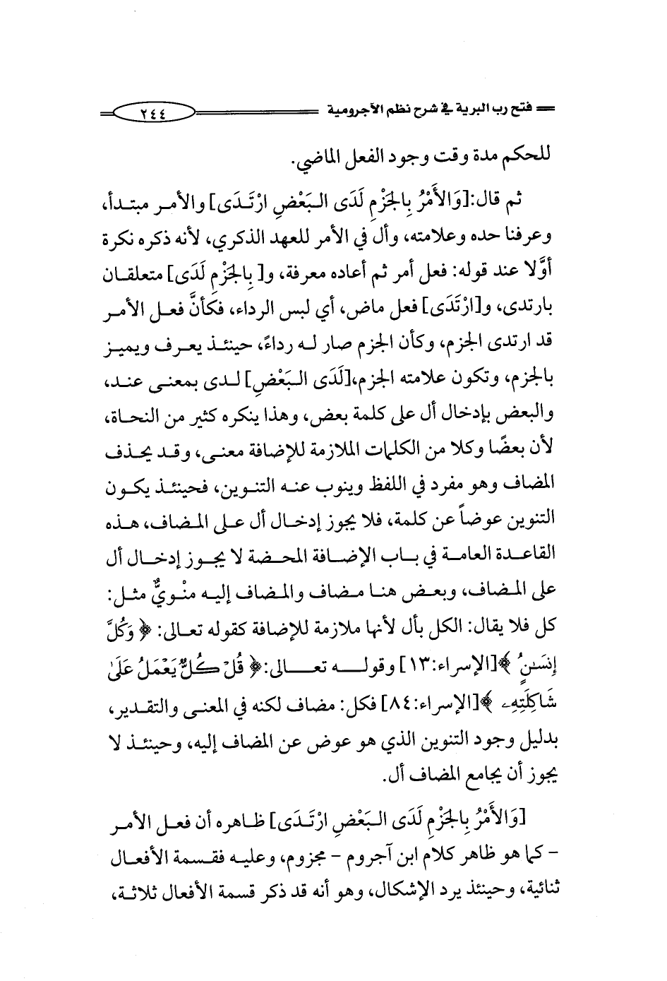ثم قال: [وَالأَمْرُ بِالجَزْمِ لَدَى البَعْضِ ارْتَدَى] والأمر مبتدأ، وعرفنا حده وعلامته، وأل في الأمر للعهد الذكري، لأنه ذكره نكرة أوَّلا عند قوله: فعل أمر ثم أعاده معرفة، و [بِالجَزْمِ لَدَى] متعلقان بارتدى، و [ارْتَدَى] فعل ماض، أي لبس الرداء، فكأنَّ فعل الأمر قد ارتدى الجزم، وكأن الجزم صار له رداءاً، حينئذ يعرف ويميز بالجزم، وتكون علامته الجزم، [لَدَى البَعْضِ] لدى بمعنى عند، والبعض بإدخال أل على كلمة بعض، وهذا ينكره كثير من النحاة، لأن بعضًا وكلا من الكلمات الملازمة للإضافة لفظاً ومعنى، وقد يحذف المضاف وهو مفرد في اللفظ وينوب عنه التنوين، فحينئذ يكون التنوين عوضاً عن كلمة، فلا يجوز إدخال أل على المضاف، هذه القاعدة العامة في باب الإضافة لا يجوز إدخال أل على المضاف، وبعض هنا مضاف والمضاف إليه منْويٌّ مثل: كل فلا يقال: الكل بأل لأنها ملازمة للإضافة كقوله: ((وَكُلَّإِنْسَانٍ ((13))) [الإسراء:13] ((قُلْكُلٌّ يَعْمَلُ عَلَى شَاكِلَتِهِ (84))) [الإسراء:84] فكل: مضاف لكنه في المعنى والتقدير، بدليل وجود التنوين الذي هو عوض عن المضاف إليه، وحينئذ لا يجوز أن يجامع المضاف أل إلا ما استثنيَ في بابه.