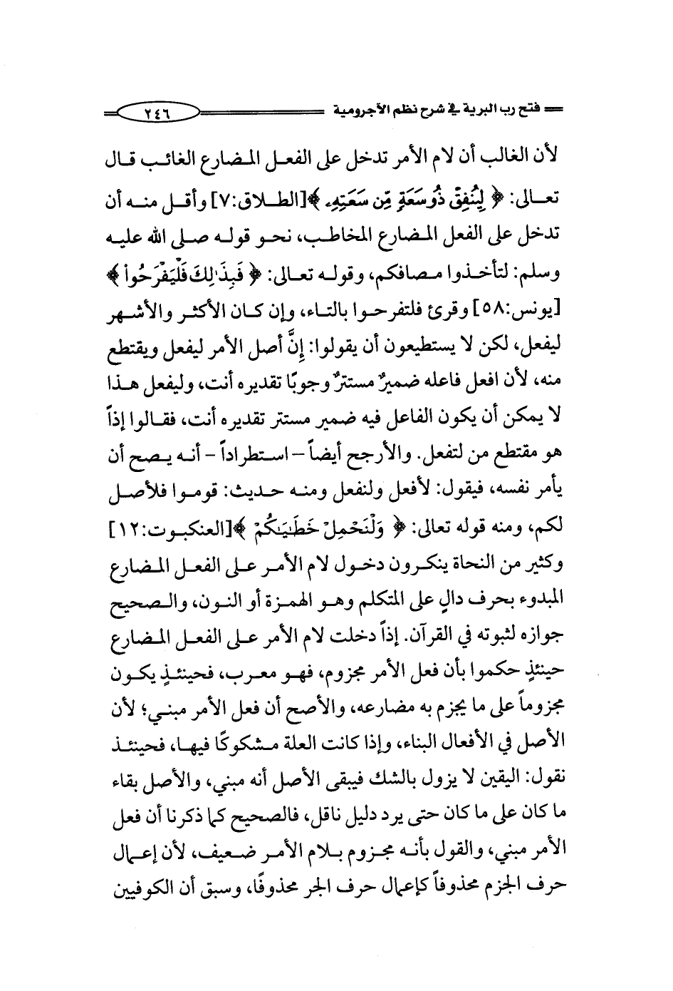 إذاً دخلت لام الأمر على الفعل المضارع حينئذٍ حكموا بأن فعل الأمر مجزوم، فهو معرب، فحينئذٍ يكون مجزوماً على ما يجزم به مضارعه، والأصح أن فعل الأمر مبني؛ لأن الأصل في الأفعال البناء، وإذا كانت العلة مشكوكًا فيها، فحينئذ نقول: اليقين لا يزول بالشك فيبقى الأصل أنه مبني، والأصل بقاء ما كان على ما كان حتى يرد دليل ناقل، فالصحيح كما ذكرنا أن فعل الأمر مبني، والقول بأنه مجزوم بلام الأمر ضعيف، لأن إعمال حرف الجزم محذوفاً كإعمال حرف الجر محذوفًا، وسبق أن الكوفيين