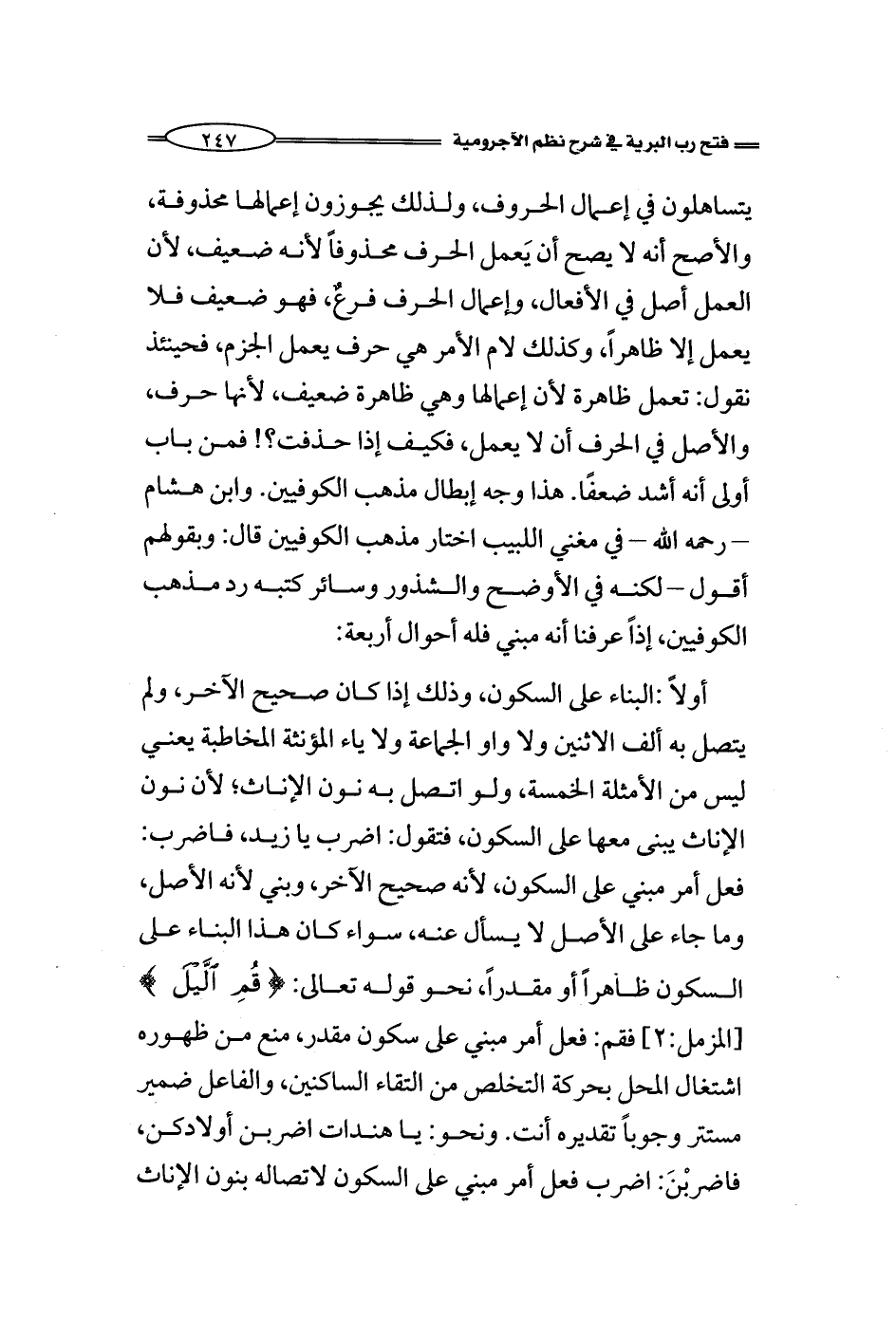 يتساهلون في إعمال الحروف، ولذلك يجوزون إعمالها محذوفة، والأصح أنه لا يصح أن يَعمل الحرف محذوفاً لأنه ضعيف، لأن العمل أَصل في الأفعال، وإعمال الحرف فرعٌ، فهو ضعيف فلا يعمل إلا ظاهراً، وكذلك لام الأمر هي حرف يعمل الجزم، فحينئذ نقول: تعمل ظاهرة لأن إعمالها وهي ظاهرة ضعيف، لأنها حرف، والأصل في الحرف أن لا يعمل، فكيف إذا حذفت؟! فمن باب أولى أنه أشد ضعفًا. هذا وجه إبطال مذهب الكوفيين. وابن هشام - رحمه الله - في مغني اللبيب اختار مذهب الكوفيين قال: وبقولهم أقول - لكنه في الأوضح والشذور وسائر كتبه رد مذهب الكوفيين، إذاً عرفنا أنه مبني فله أحوال أربعة:
