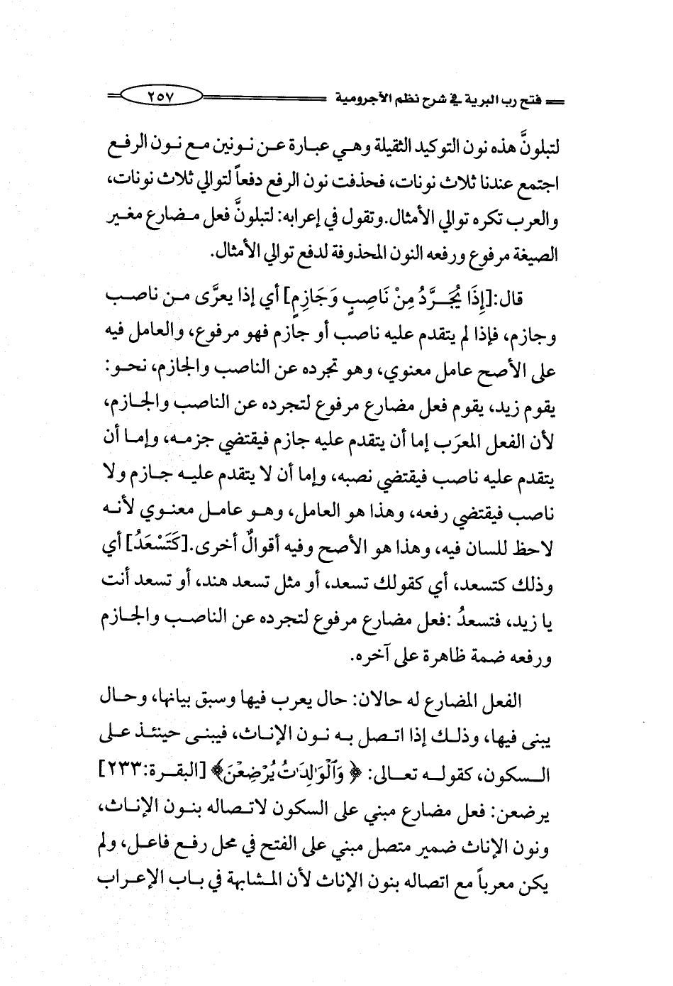 قال: [إِذَا يُجَرَّدُ مِنْ نَاصِبٍ وَجَازِمٍ] أي إذا يعرَّى من ناصب وجازم، فإذا لم يتقدم عليه ناصب أو جازم فهو مرفوع، والعامل فيه على الأصح عامل معنوي، وهو تجرده عن الناصب والجازم، نحو: يقوم زيد، يقوم فعل مضارع مرفوع لتجرده عن الناصب والجازم، لأن الفعل المعرَب إما أن يتقدم عليه جازم فيقتضي جزمه، وإما أن يتقدم عليه ناصب فيقتضي نصبه، وإما أن لا يتقدم عليه جازم ولا ناصب فيقتضي رفعه، وهذا هو العامل، وهو عامل معنوي لأنه لاحظ للسان فيه، وهذا هو الأصح وفيه أقوالٌ أخرى. [كَتَسْعَدُ] أي وذلك كتسعد، أي كقولك تسعد، أو مثل تسعد هند، أو تسعد أنت يا زيد، فتسعدُ: فعل مضارع مرفوع لتجرده عن الناصب والجازم ورفعه ضمة ظاهرة على آخره.