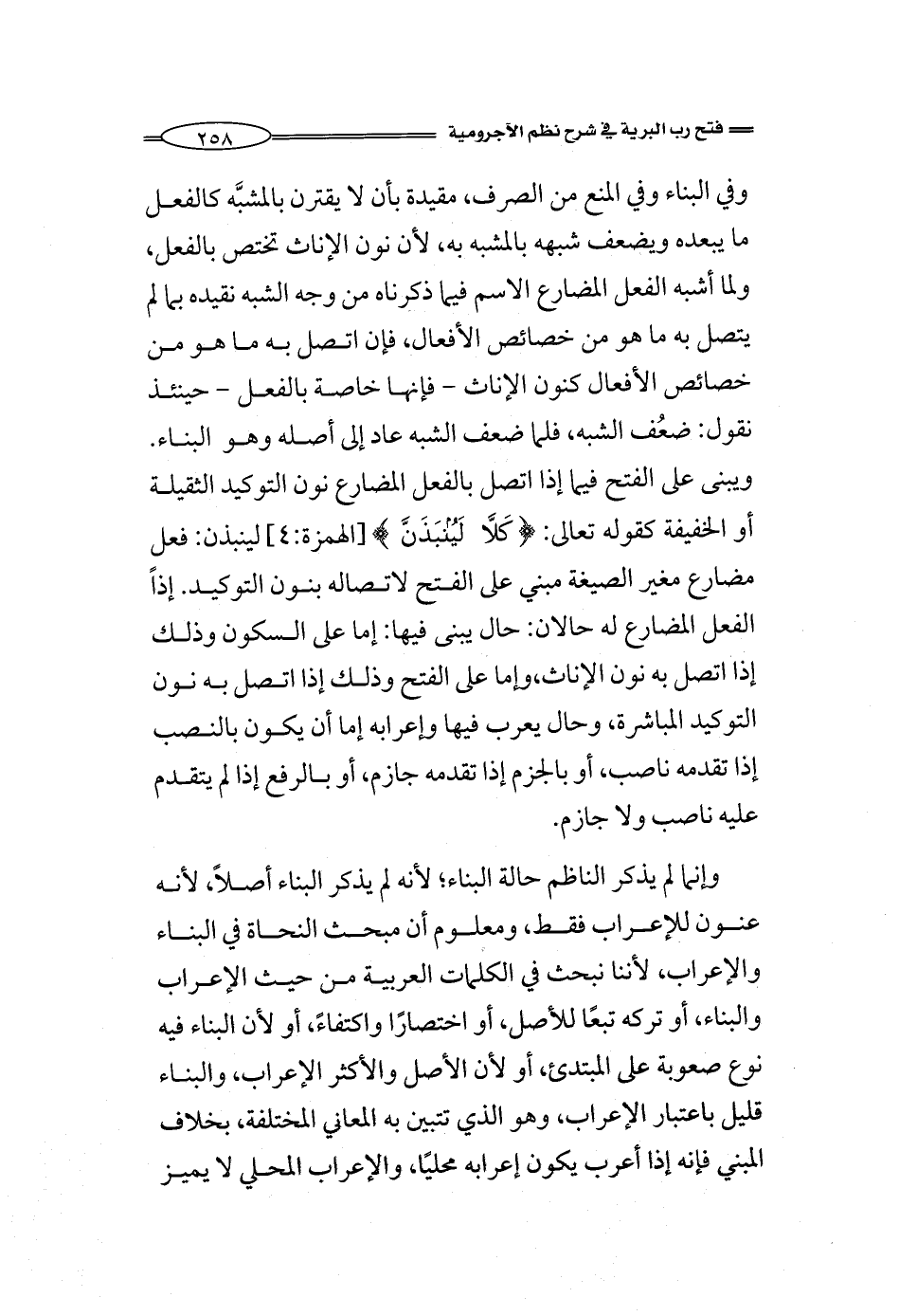 وفي البناء وفي المنع من الصرف، مقيدة بأن لا يقترن بالفعل ما يبعده ويضعف شبهه بالمشبه به، لأن نون الإناث هذه تختص بالفعل، ولما أشبه الفعل المضارع الاسم فيما ذكرناه من وجه الشبه نقيده بما لم يتصل به ما هو من خصائص الأفعال، فإن اتصل به ما هو من خصائص الأفعال كنون الإناث - فإنها خاصة بالفعل - حينئذ نقول: ضعُف الشبه، فلما ضعف الشبه عاد إلى أصله وهو البناء. ويبنى على الفتح فيما إذا اتصل بالفعل المضارع نون التوكيد الثقيلة أو الخفيفة: ((* كَلَّا لَيُنْبَذَنَّ (4))) [الهمزة:4] لينبذن: فعل مضارع مبني على الفتح لاتصاله بنون التوكيد. إذاً الفعل المضارع له حالان: حال يبنى فيها: إما على السكون وذلك إذا اتصل به نون الإناث، وإما على الفتح وذلك إذا اتصل به نون التوكيد المباشرة، وحال يعرب فيها وإعرابه إما أن يكون بالنصب إذا تقدمه ناصب، أو بالجزم إذا تقدمه جازم، أو بالرفع إذا لم يتقدم عليه ناصب ولا جازم.