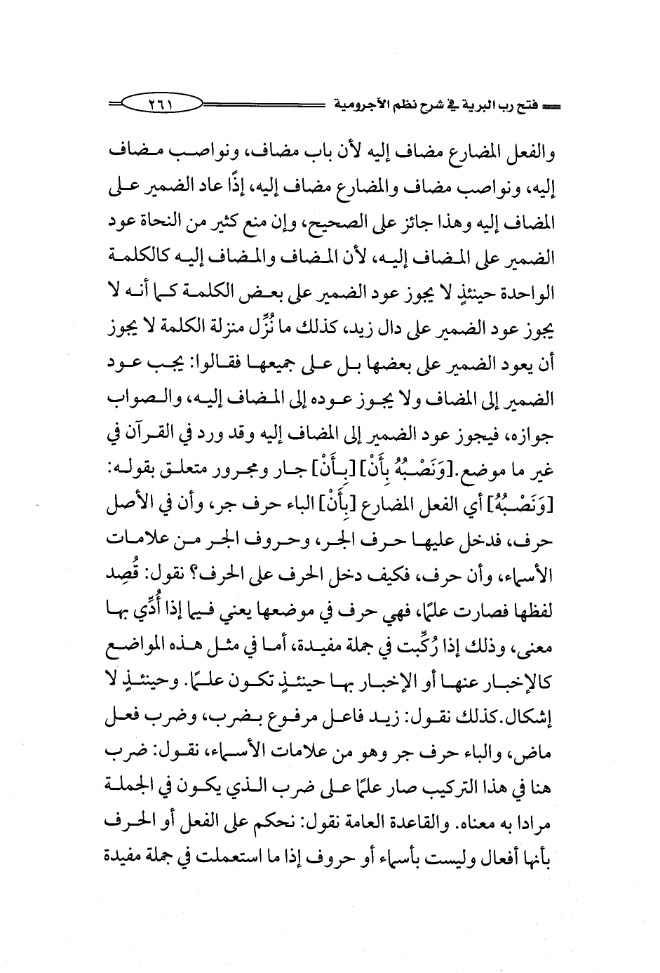 والفعل المضارع مضاف إليه لأن باب مضاف، ونواصب مضاف إليه، ونواصب مضاف والمضارع مضاف إليه، إذًا عاد الضمير على المضاف إليه وهذا جائز على الصحيح، وإن منع كثير من النحاة عود الضمير على المضاف إليه، لأن المضاف والمضاف إليه كالجزء الواحد أو كالكلمة الواحدة حينئذٍ لا يجوز عود الضمير على بعض الكلمة كما أنه لا يجوز عود الضمير على دال زيد، كذلك ما نُزِّل منزلة الكلمة لا يجوز أن يعود الضمير على بعضها دونها كلها فقالوا: يجب عود الضمير إلى المضاف ولا يجوز عوده إلى المضاف إليه، والصواب جوازه، فيجوز عود الضمير إلى المضاف إليه وقد ورد في القرآن في غير ما موضع. [وَنَصْبُهُ بِأَنْ] [بِأَنْ] جار ومجرور متعلق بقوله: [وَنَصْبُهُ] أي الفعل المضارع [بِأَنْ] الباء حرف جر، وأن في الأصل حرف، فدخل عليها حرف الجر، وحروف الجر من علامات الأسماء، وأن حرف، فكيف دخل الحرف على الحرف؟ نقول: قُصِد لفظها فصارت علمًا، فهي حرف في موضعها يعني فيما إذا أُدِّي بها معنى، وذلك إذا رُكِّبت في جملة مفيدة، أما في مثل هذه المواضع كالإخبار عنها أو الإخبار بها حينئذٍ تكون علمًا. وحينئذٍ لا إشكال. كذلك نقول: زيد فاعل مرفوع بضرب، وضرب فعل ماض، والباء حرف جر وهو من علامات الأسماء، نقول: ضرب هنا في هذا التركيب صار علمًا على ضرب الذي يكون في الجملة مرادا به معناه. والقاعدة العامة نقول: نحكم على الفعل أو الحرف بأنها أفعال وليست بأسماء أو حروف إذا ما استعملت في جملة مفيدة