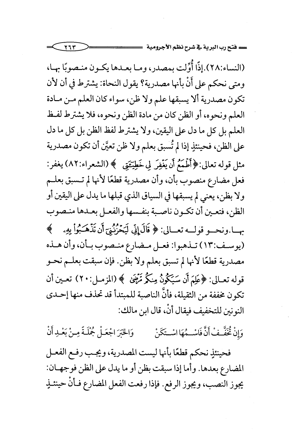 (النساء:28).إذًا أُوِّلت بمصدر، وما بعدها يكون منصوبًا بها، ومتى نحكم على أَنْ بأنها مصدرية؟ يقول النحاة: يشترط في أن لأن تكون مصدرية ألا يسبقها علم ولا ظن، سواء كان العلم من مادة العلم ونحوه، أو الظن كان من مادة الظن ونحوه، فلا يشترط لفظ العلم بل كل ما دل على اليقين، ولا يشترط لفظ الظن بل كل ما دل على الظن، فحينئذٍ إذا لم تُسبق بعلم ولا ظن تعيَّن أن تكون مصدرية مثل قوله: {أَطْمَعُ أَنْ يَغْفِرَ لِي خَطِيئَتِي} (الشعراء:82) يغفر: فعل مضارع منصوب بأن، وأن مصدرية قطعًا لأنها لم تسبق بعلم ولا بظن، يعني لم يسبقها في السياق الذي قبلها ما يدل على اليقين أو الظن، فتعين أن تكون ناصبة بنفسها والفعل بعدها منصوب بها. ونحو: {قَالَ إِنِّي لَيَحْزُنُنِي أَنْ تَذْهَبُوا بِهِ} (يوسف:13) تذهبوا: فعل مضارع منصوب بأن، وأن هذه مصدرية قطعًا لأنها لم تسبق بعلم ولا بظن. فإن سبقت بعلم نحو: {عَلِمَ أَنْ سَيَكُونُ مِنْكُمْ مَرْضَى} (المزمل:20) تعين أن تكون مخففة من الثقيلة، إنَّ، وأنَّ الناصبتان قد تحذف إحدى النونين للتخفيف فيقال إنْ وأنْ، قال ابن مالك: