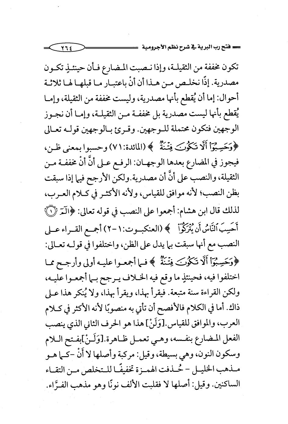 تكون مخففة من الثقيلة، وإذا نصبت المضارع فأن حينئذٍ تكون مصدرية. إذًا نخلص من هذا أن أنْ باعتبار ما قبلها لها ثلاثة أحوال: إما أن يُقطع بأنها مصدرية، وليست مخففة من الثقيلة، وإما يُقطع بأنها ليست مصدرية بل مخففة من الثقيلة، وإما أن نجوز الوجهين فتكون محتملة للوجهين. وقرئ بالوجهين {وَحَسِبُوا أَلَّا تَكُونَ فِتْنَةٌ} (المائدة:71) وحسبوا بمعنى ظن، فيجوز في المضارع بعدها الوجهان: الرفع على أنَّ أنْ مخففة من الثقيلة, والنصب على أنَّ أن مصدرية. ولكن الأرجح فيما إذا سبقت بظن النصب؛ لأنه موافق للقياس، ولأنه الأكثر في كلام العرب، لذلك قال ابن هشام: أجمعوا على النصب في قوله تعالى: {الم أَحَسِبَ النَّاسُ أَنْ يُتْرَكُوا} (العنكبوت:1 - 2) أجمع القراء على النصب مع أنها سبقت بما يدل على الظن، واختلفوا في قوله: {وَحَسِبُوا أَلَّا تَكُونَ فِتْنَةٌ} فما أجمعوا عليه أولى وأرجح مما اختلفوا فيه، فحينئذٍ ما وقع فيه الخلاف يرجح بما أجمعوا عليه، ولكن القراءة سنة متبعة. فيقرأ بهذا، ويقرأ بهذا، ولا يُنكر هذا على ذاك. أما في الكلام فالأفصح أن تأتي به منصوبًا لأنه الأكثر في كلام العرب، والموافق للقياس. [وَلَنْ] هذا هو الحرف الثاني الذي ينصب الفعل المضارع بنفسه، وهي تعمل ظاهرة. [وَلَنْ] بفتح اللام وسكون النون، وهي بسيطة، وقيل: مركبة وأصلها لا أَنْ -كما هو مذهب الخليل - حُذفت الهمزة تخفيفًا للتخلص من التقاء الساكنين. وقيل: أصلها لا فقلبت الألف نونًا وهو مذهب الفرَّاء.